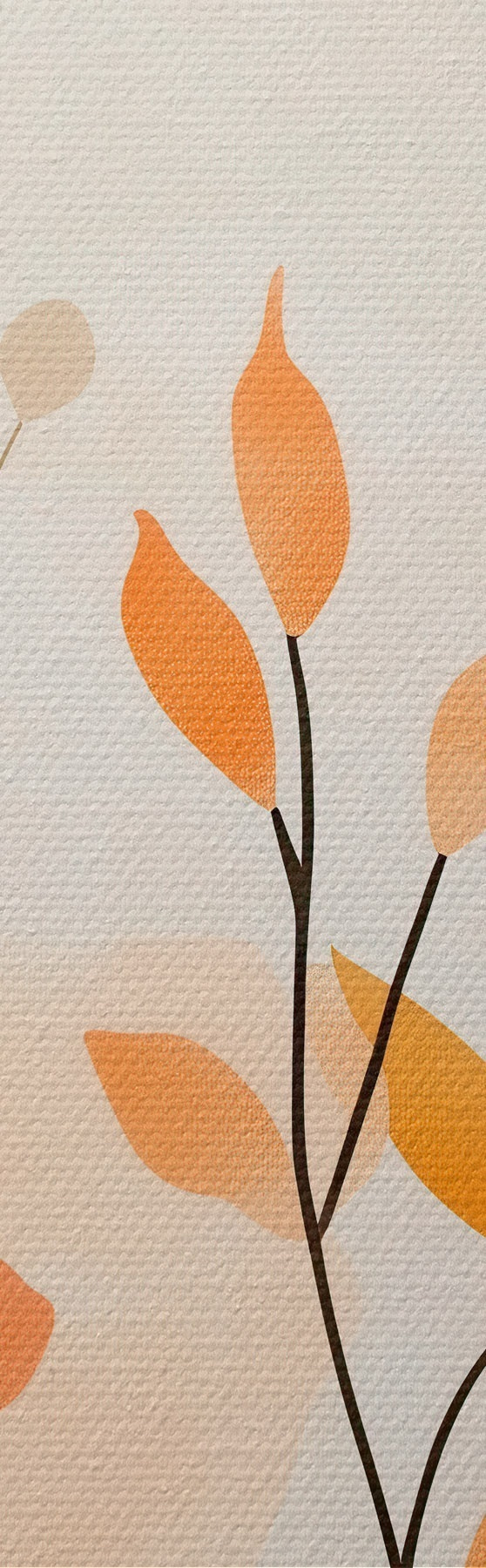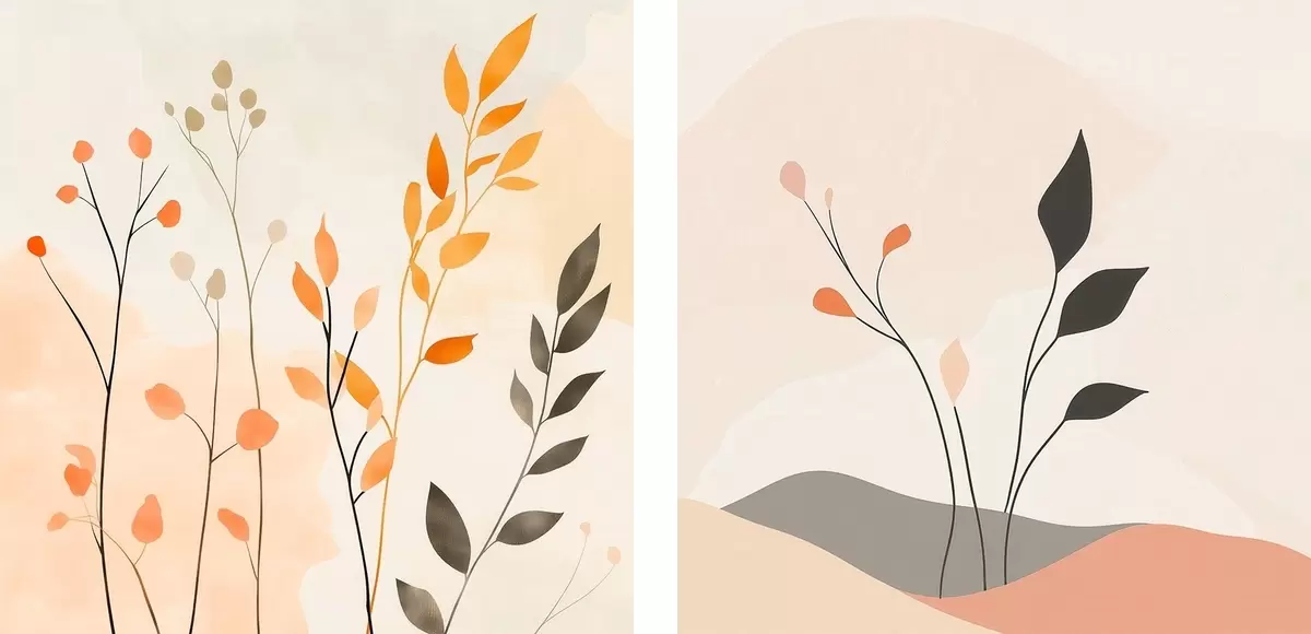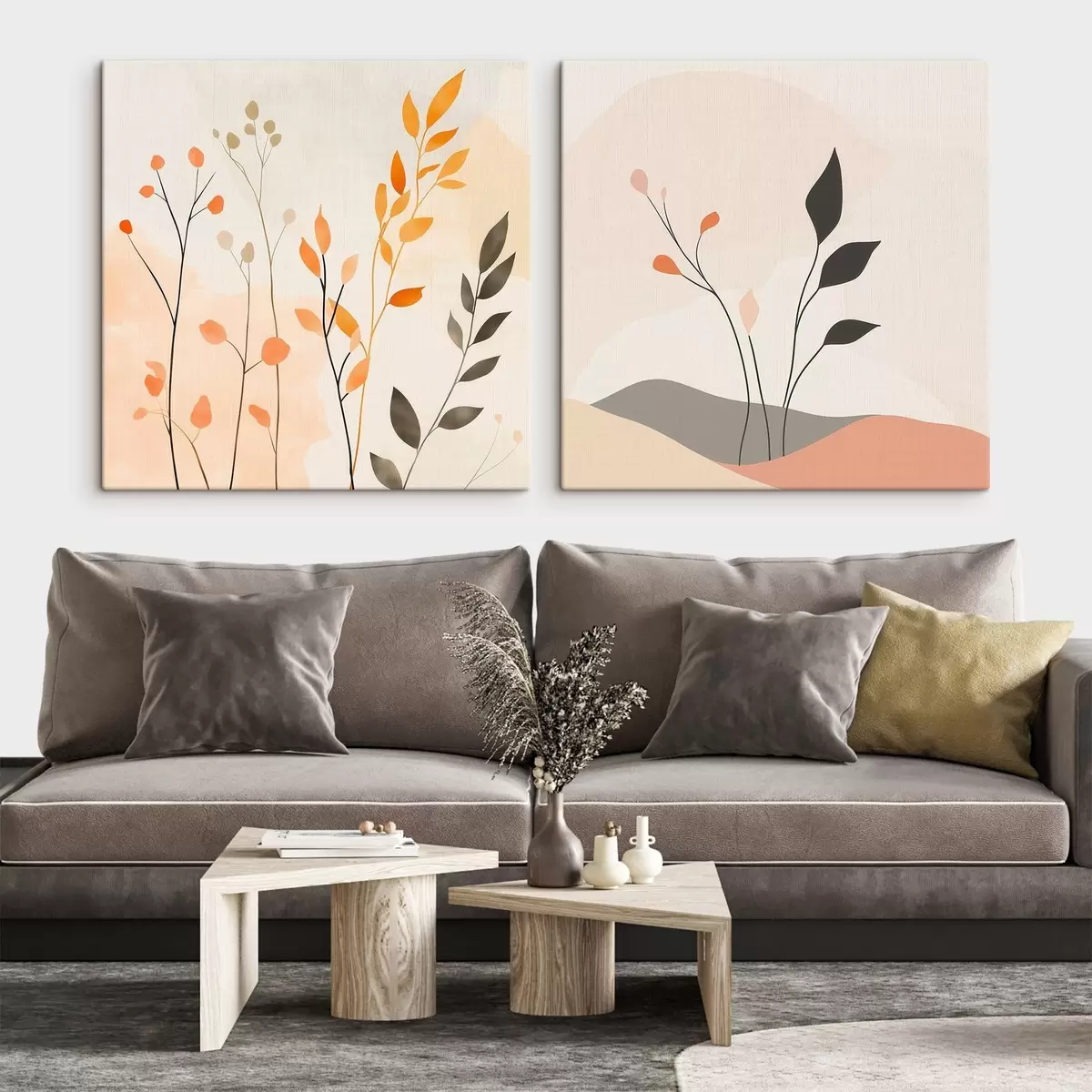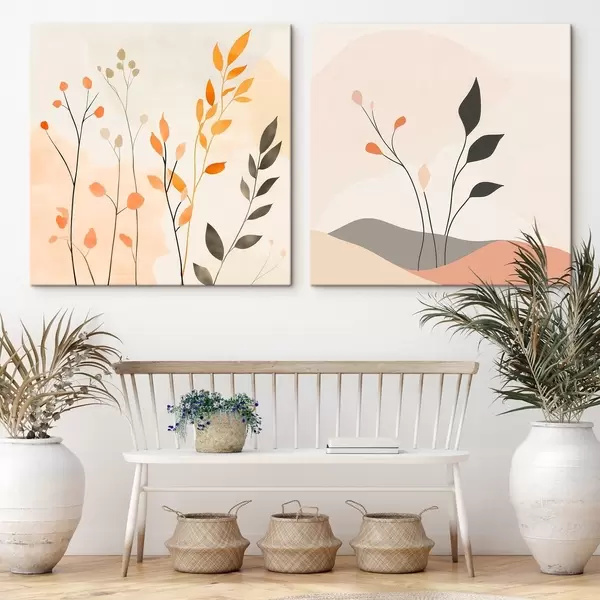Tableau Diptyque floral aux tons chauds beige-corail, rehaussé de lignes graphiques dans un style minimaliste m30363