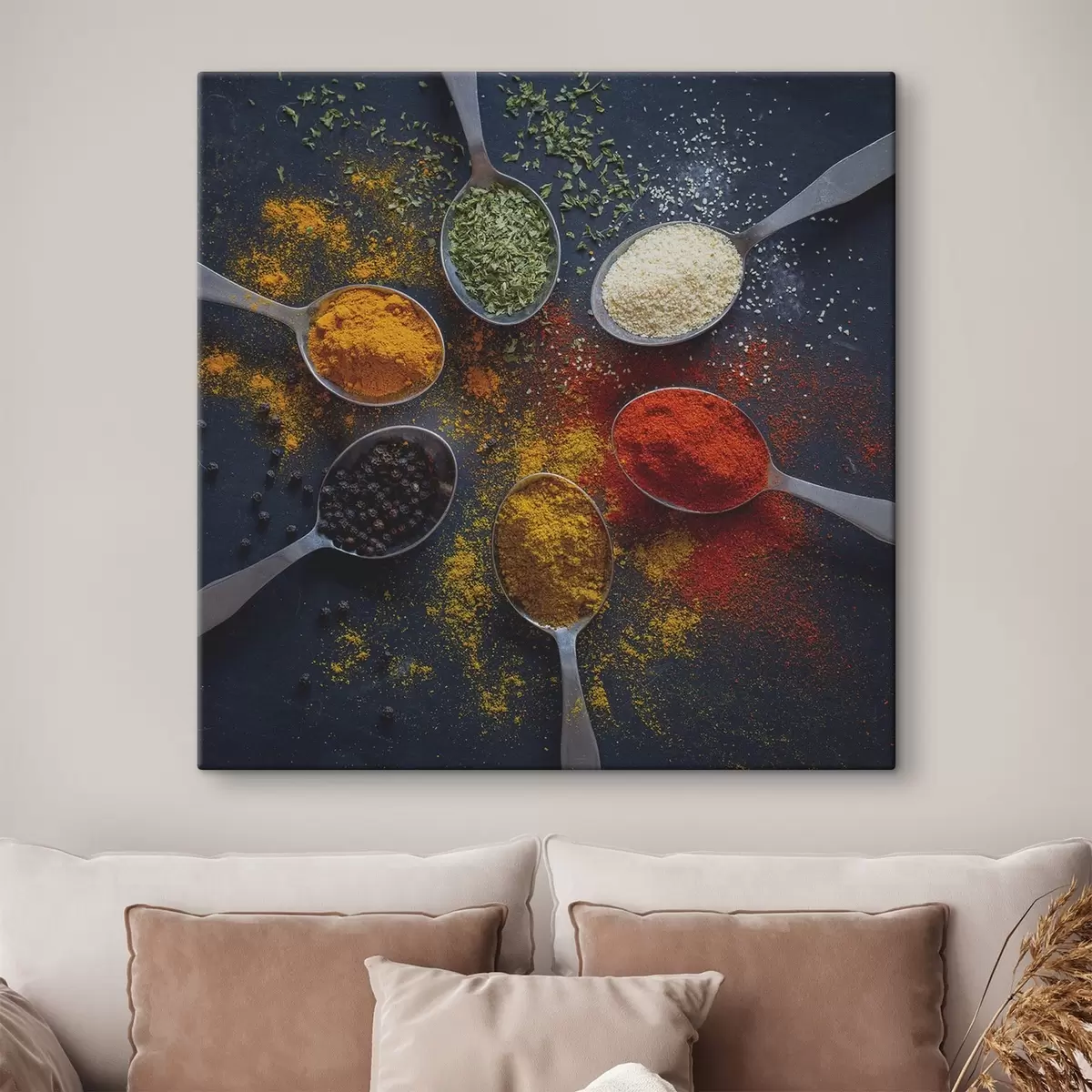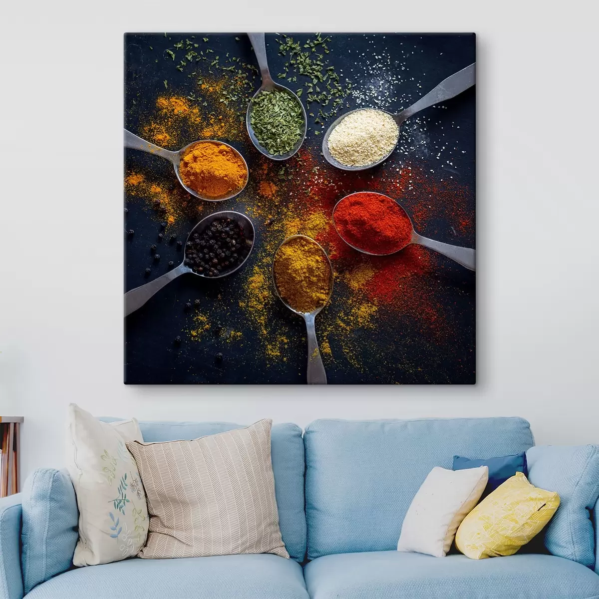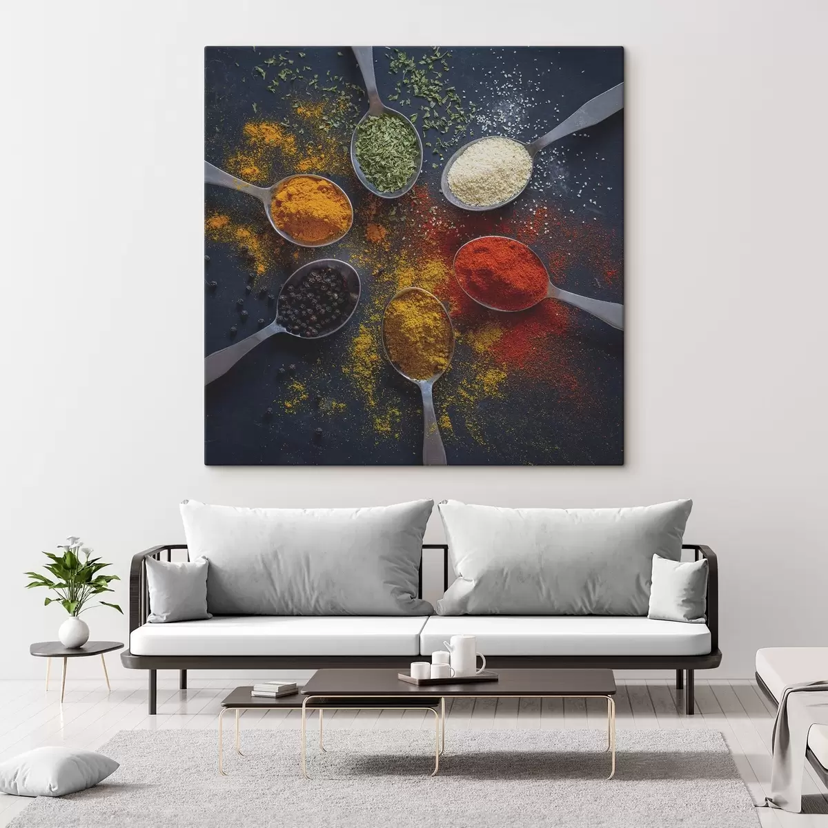 Tableau Un groupe de cuillères avec différentes épices s37046
