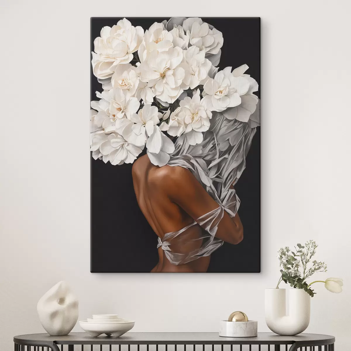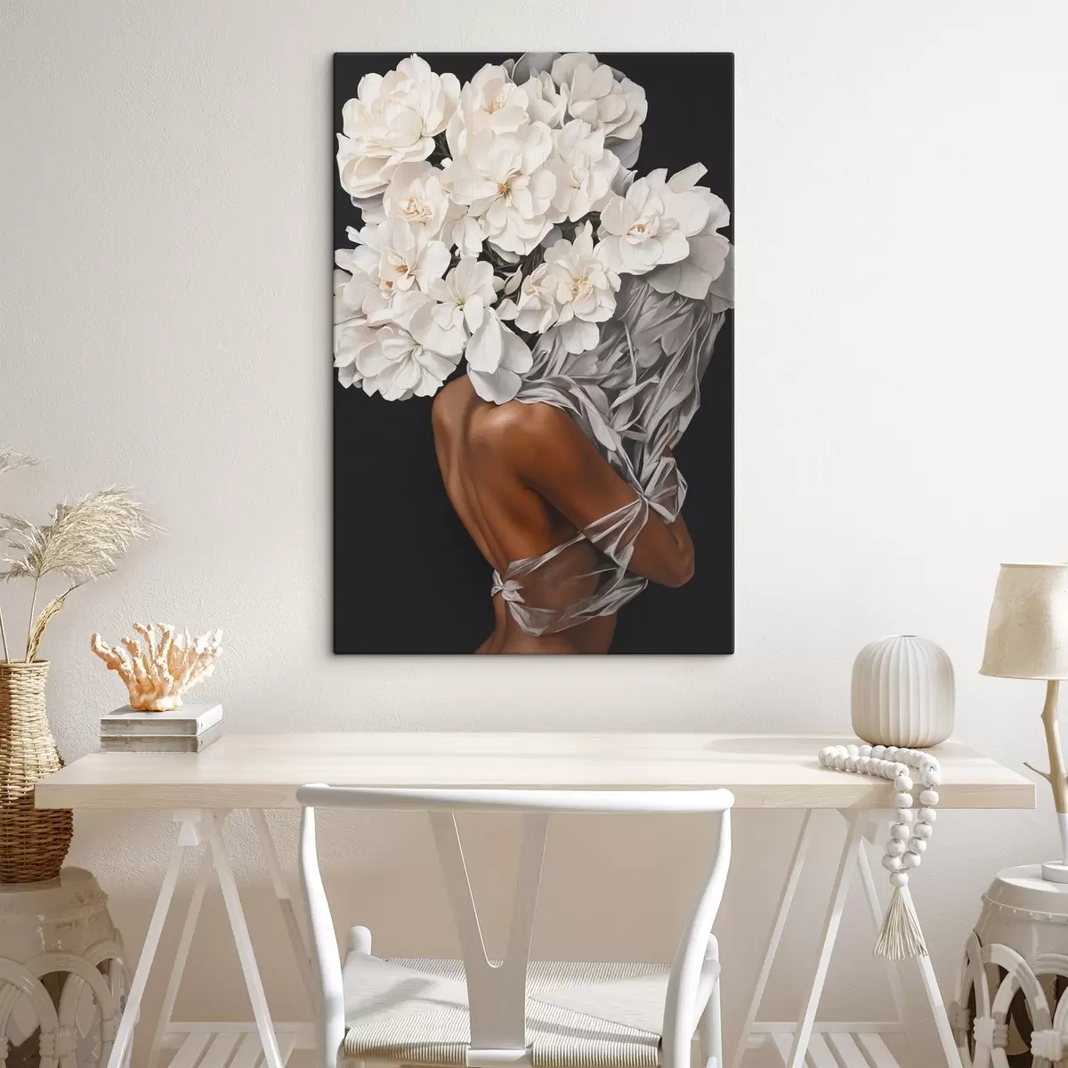 Tableau Femme avec des fleurs blanches sur fond noir s37163