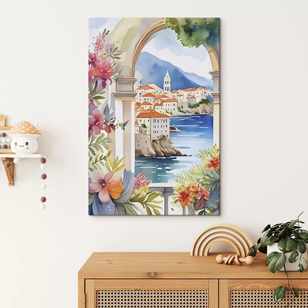 Tableau Architecture méditerranéenne, aquarelle, fleurs d'été, mer bleue, montagnes s38408