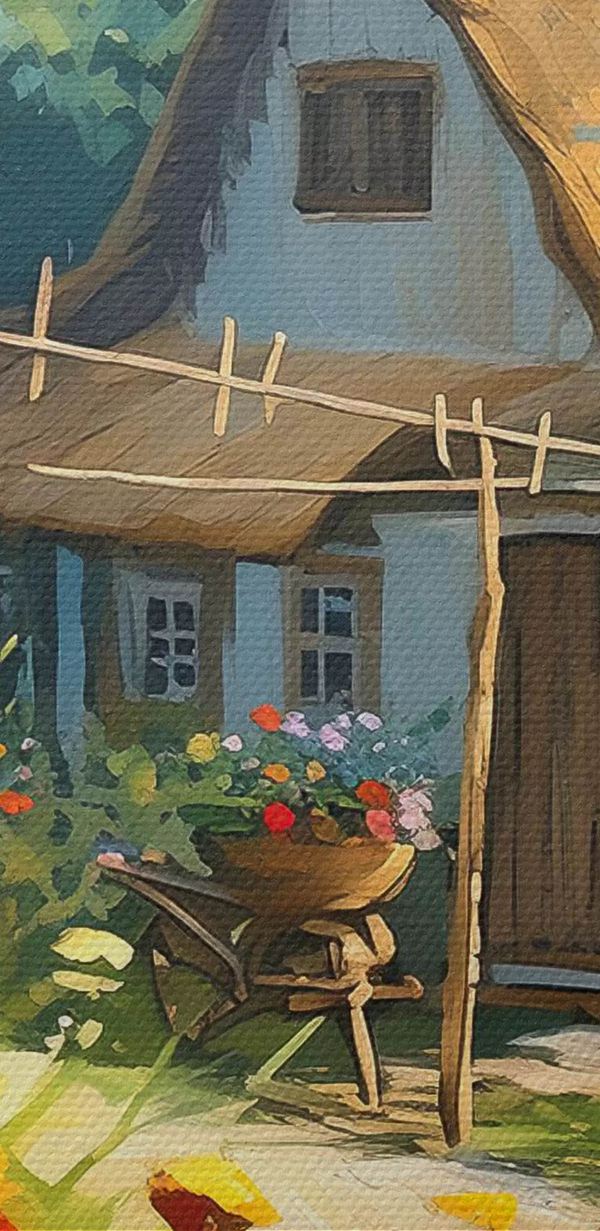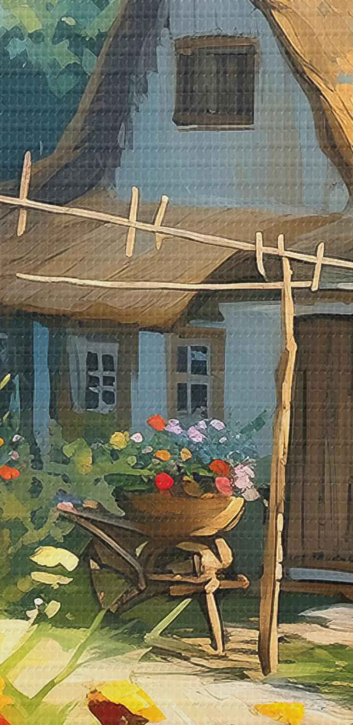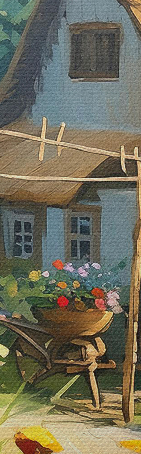Tableau Maison de village avec jardin, fleurs d'été, peinture à l'huile, coups de pinceau, champ, style rustique s38491