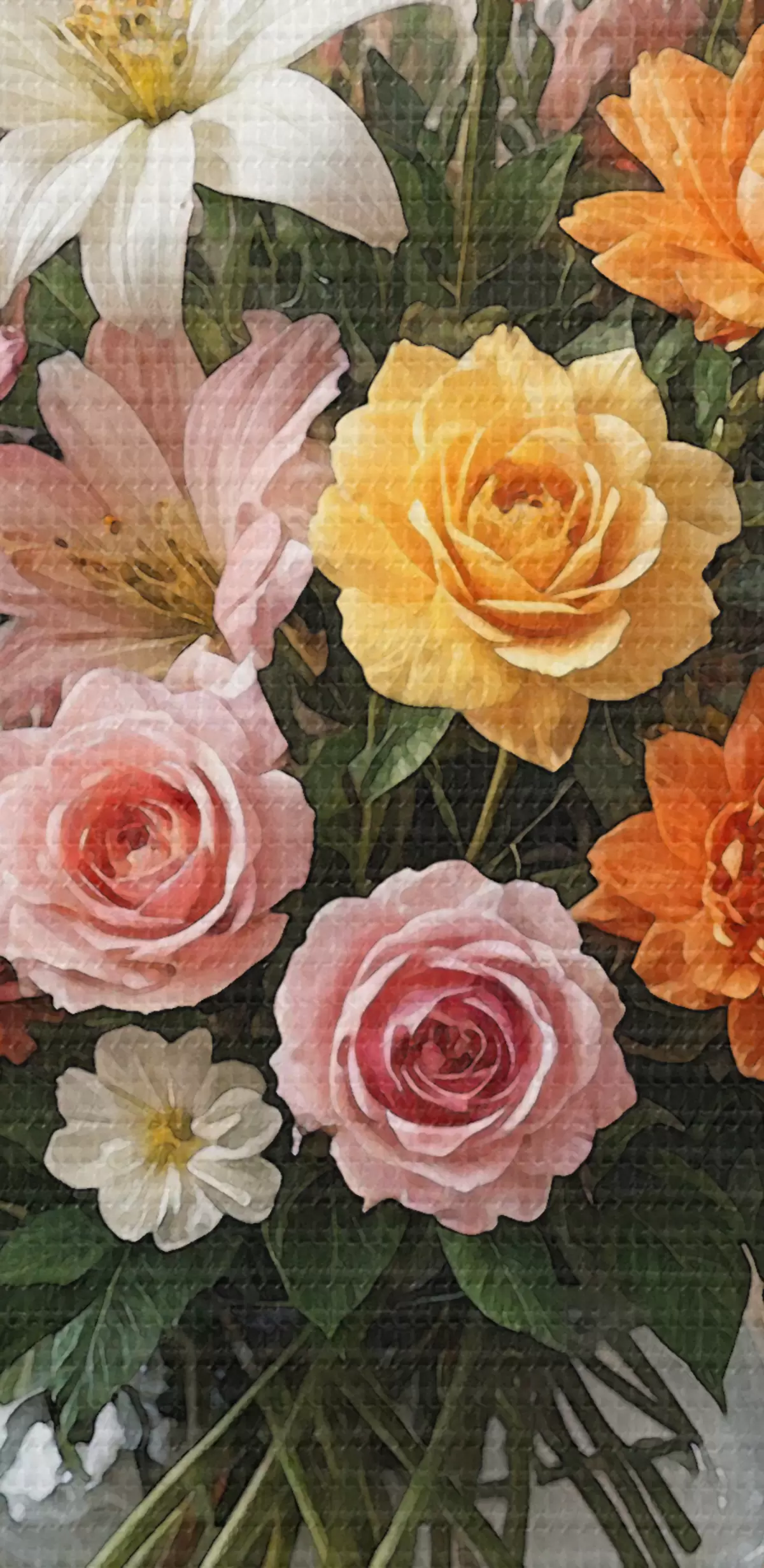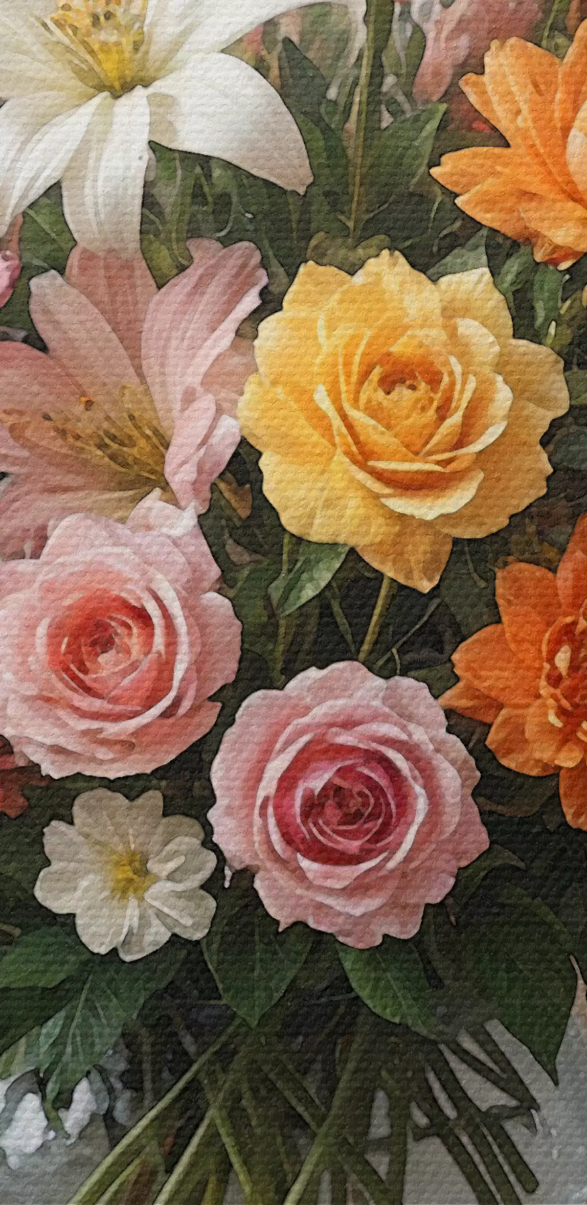 Tableau Un bouquet vibrant de diverses fleurs colorées dans un vase en verre sur une nappe blanche, peinture d'art vintage s38825