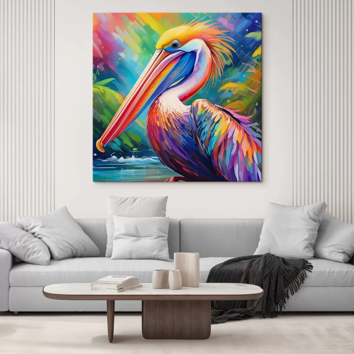 Tableau Pélican vibrant sur fond coloré s39054