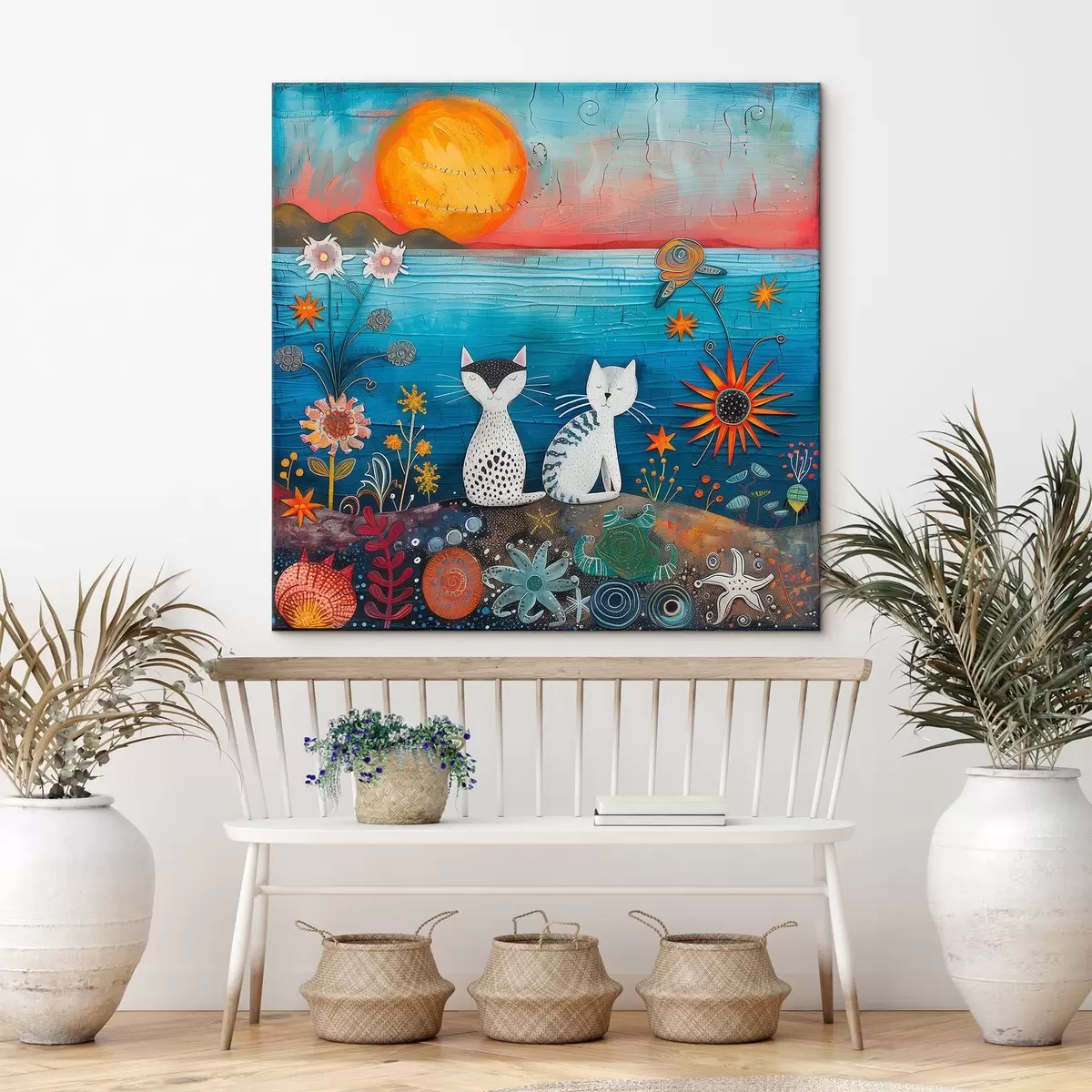 Tableau Chats au coucher du soleil, fleurs colorées s39085