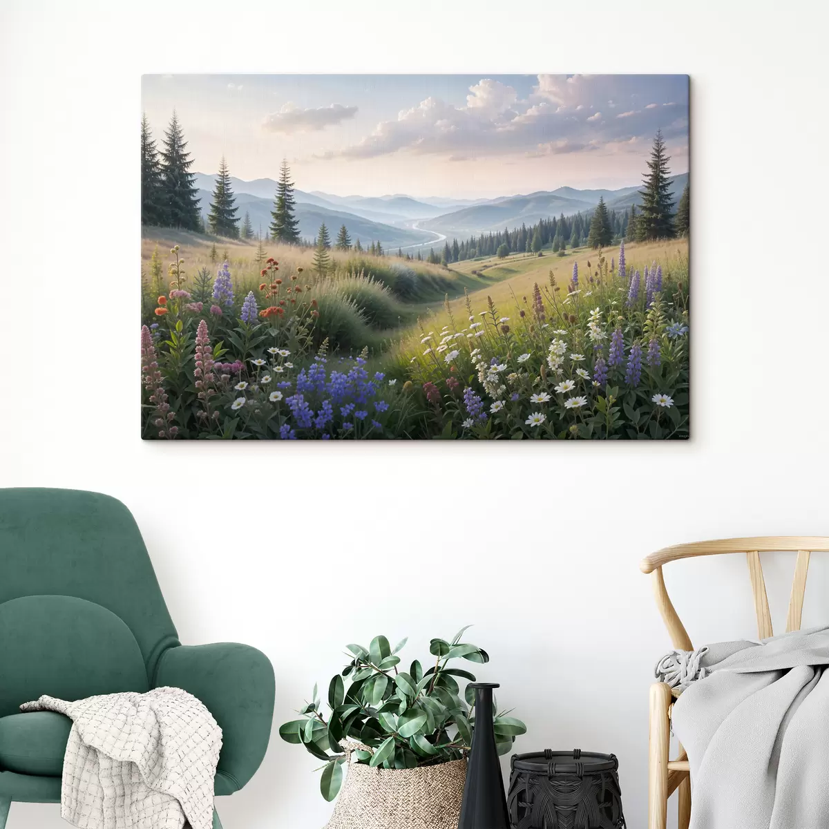 Tableau Paysage de montagne avec une prairie herbeuse au premier plan remplie de fleurs sauvages colorées Nr s39382