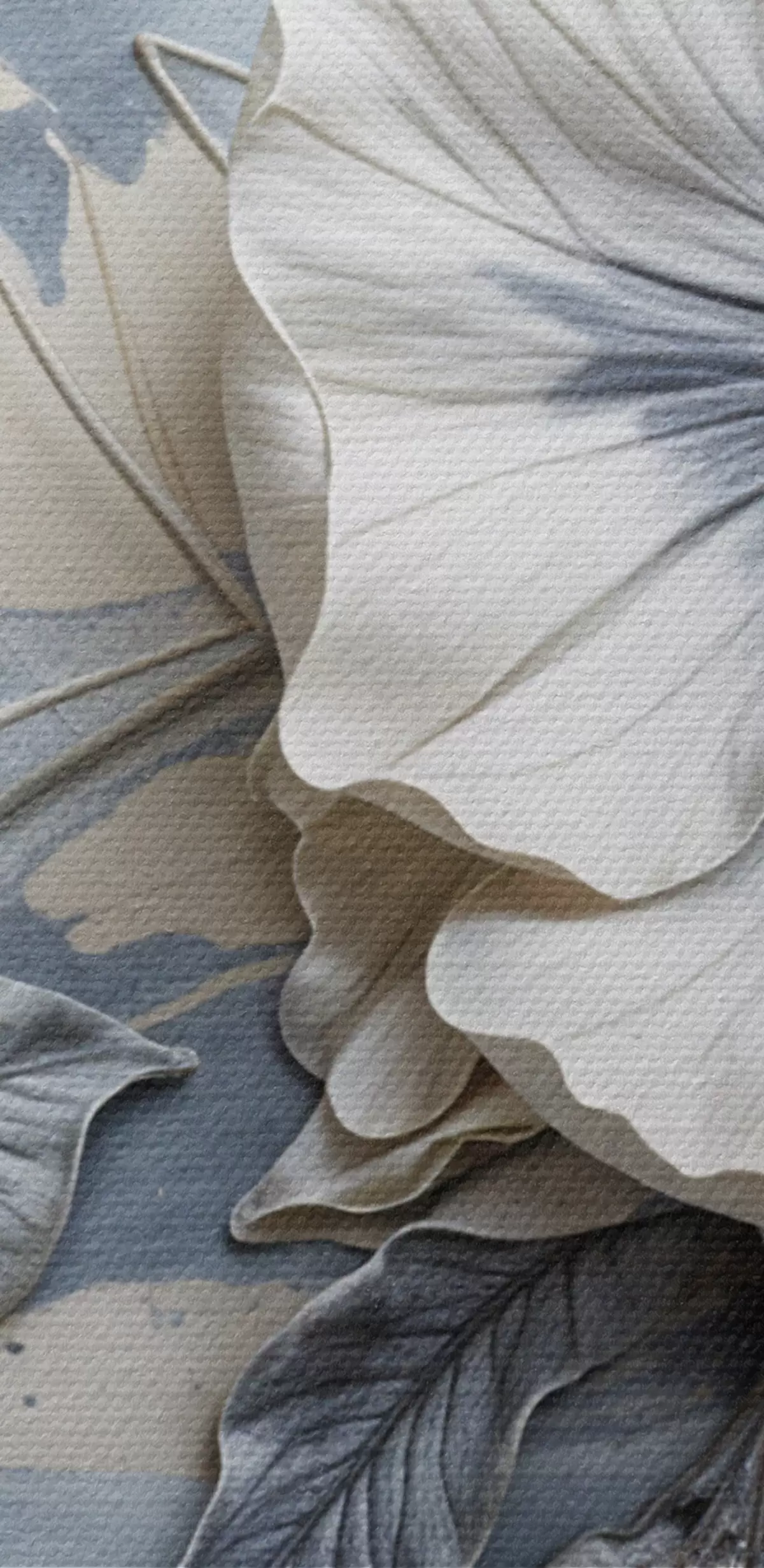 Tableau Grande peinture à l'huile grise et blanche représentant des fleurs aux détails complexes, sur un arrière-plan doux et flou s39385