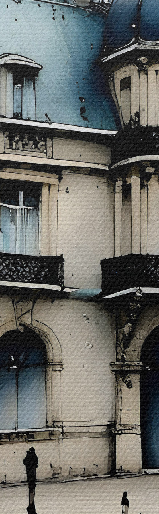 Tableau Un grand bâtiment d'aquarelle entouré de lampadaires et d'arbres, un jour de pluie Nr s39391