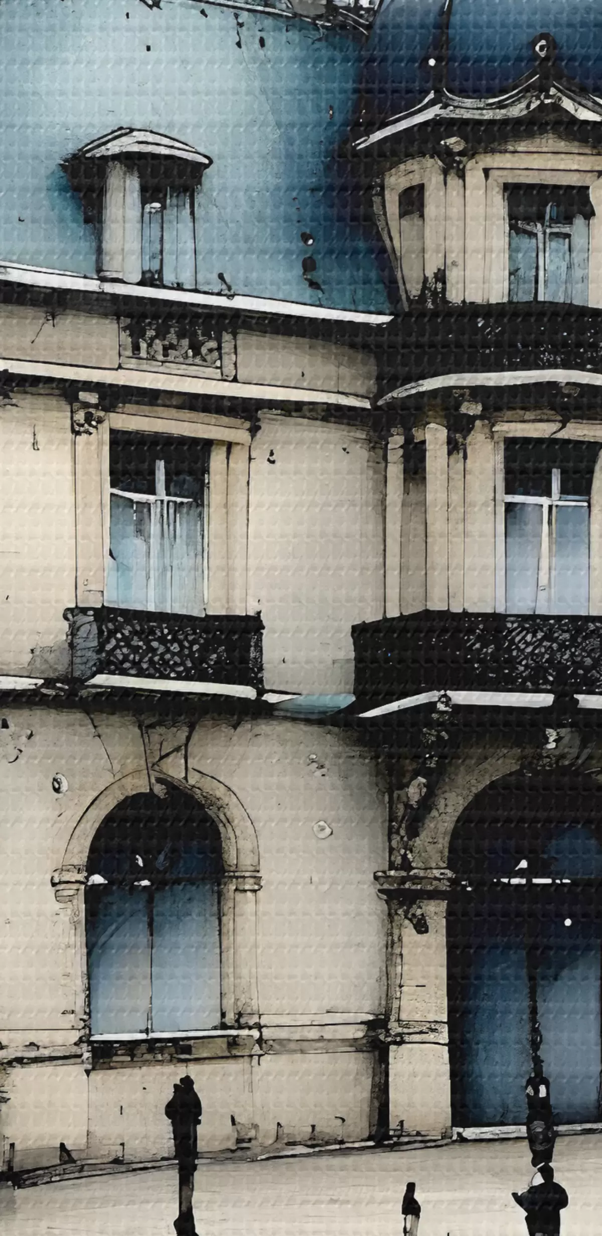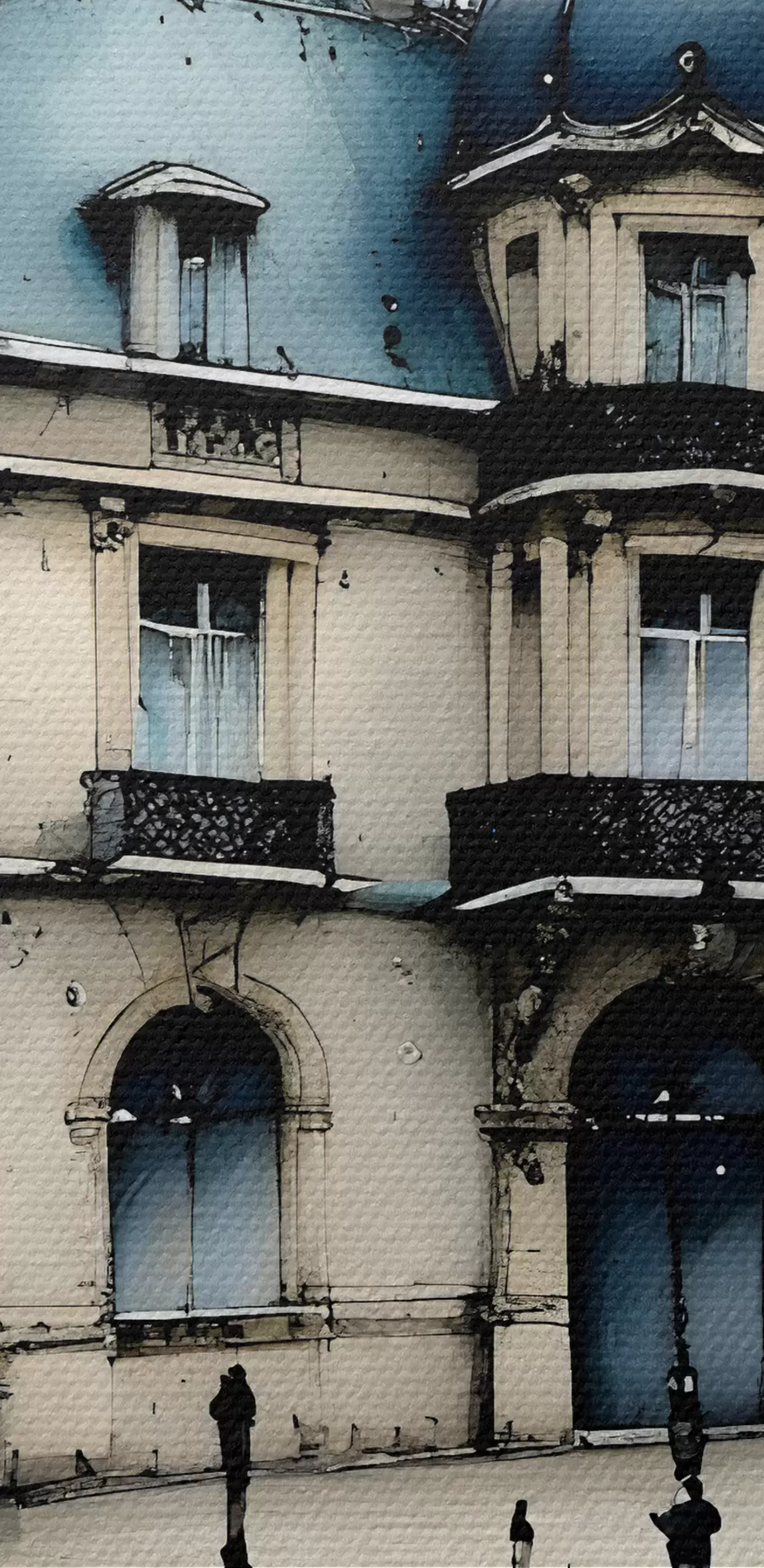Tableau Un grand bâtiment d'aquarelle entouré de lampadaires et d'arbres, un jour de pluie Nr s39391