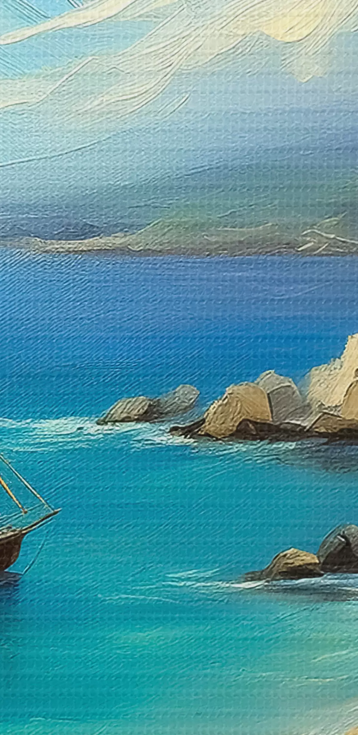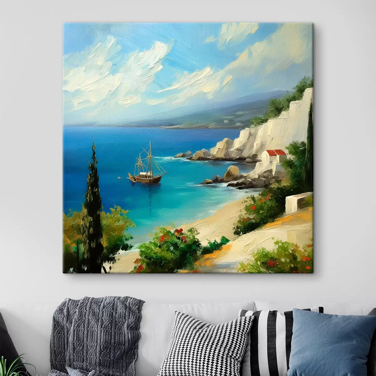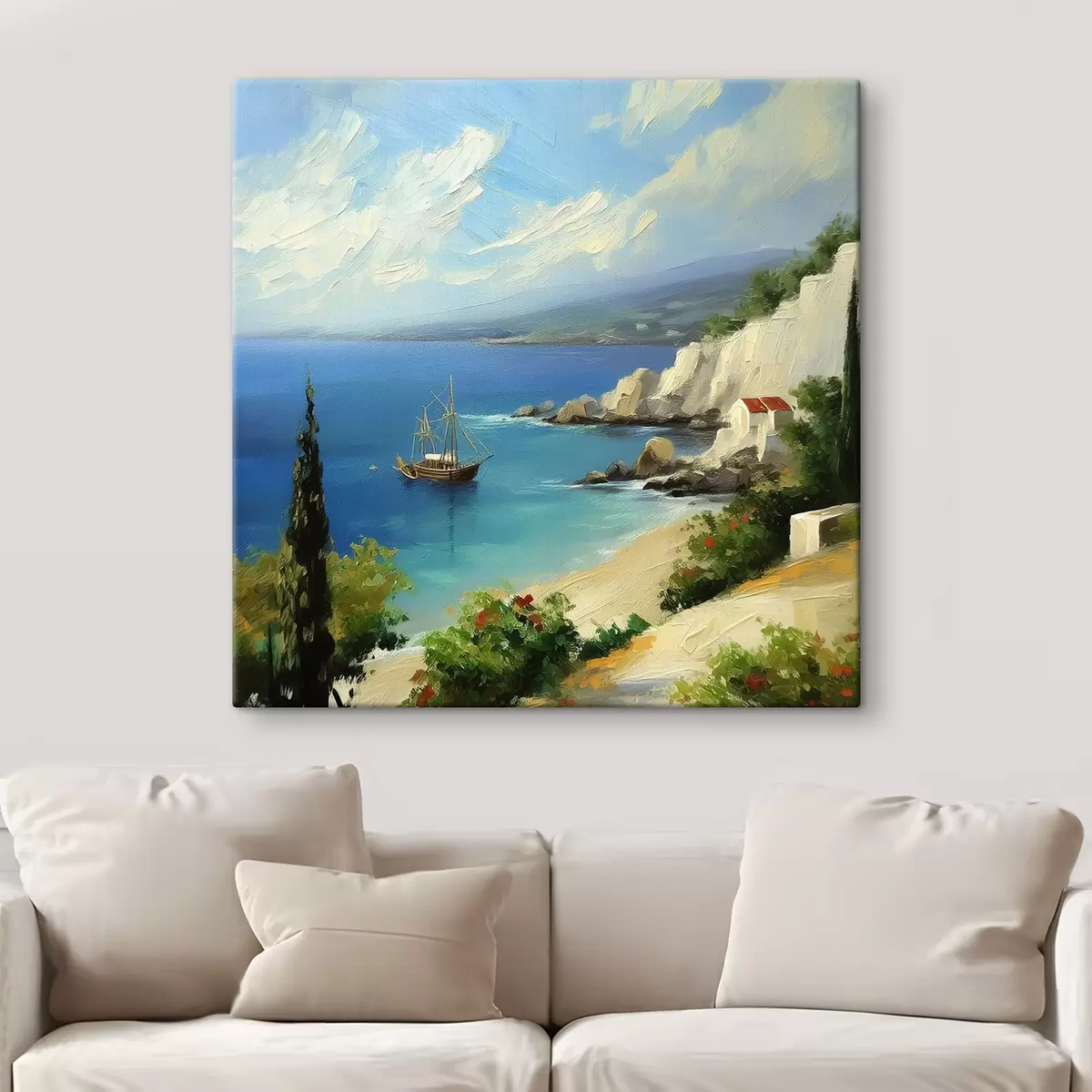 Tableau Côte maritime de Grèce, navire, eau bleue, peinture à l'huile, nature estivale, rochers, coups de pinceau vifs s39425