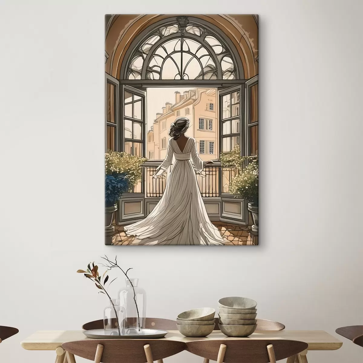 Tableau silhouette d'une jeune fille vêtue d'une robe blanche près d'une grande fenêtre Nr s39480