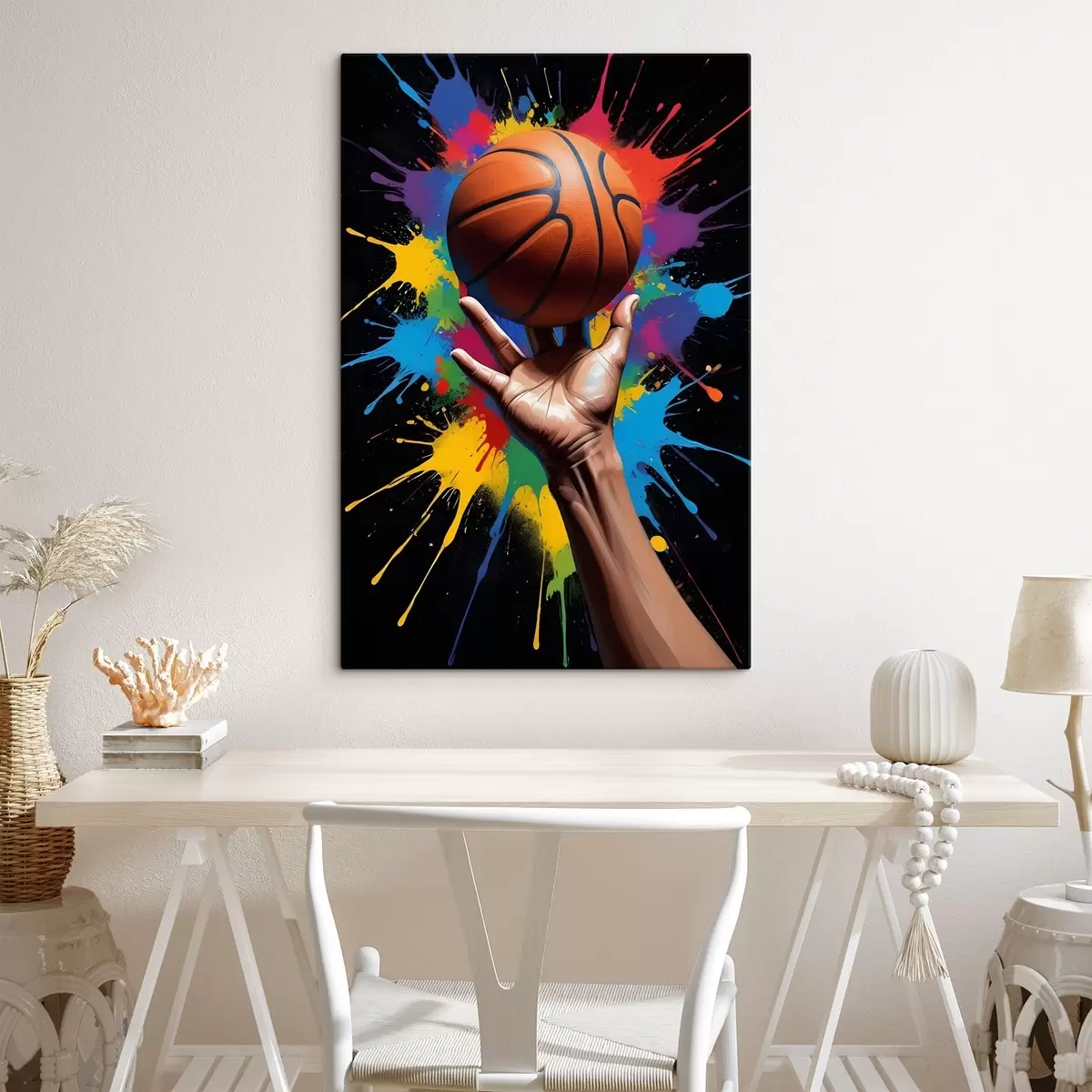 Tableau Une main tenant un ballon de basket sur un fond de peinture éclaboussée colorée s39529