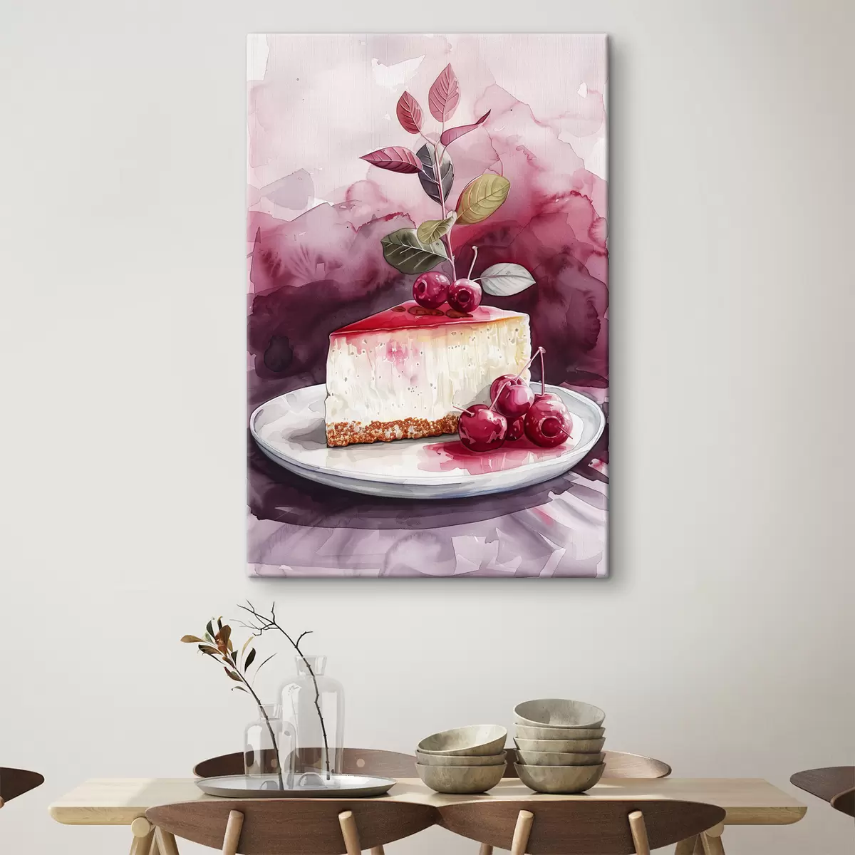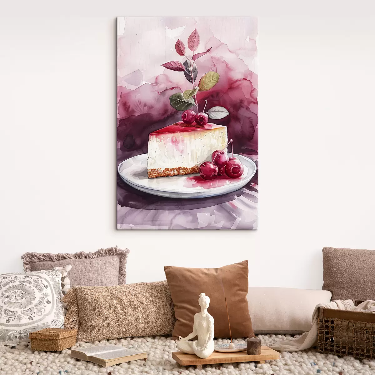 Tableau Cheesecake aquarelle aux cerises, art culinaire élégant, couleurs rouge et violet s39700