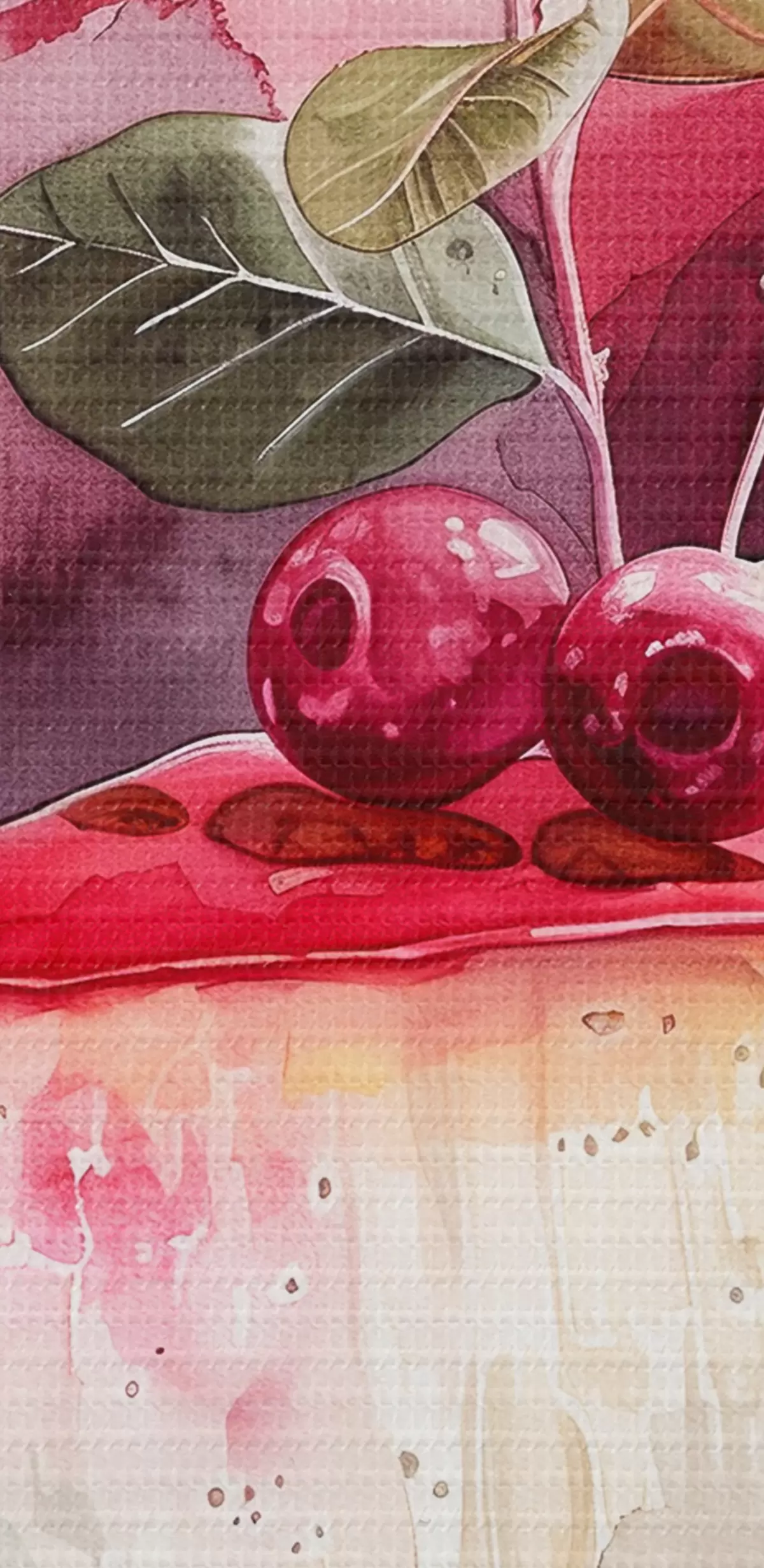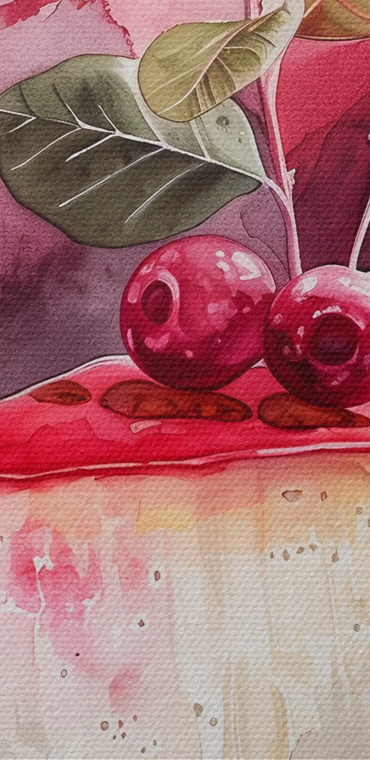 Tableau Cheesecake aquarelle aux cerises, art culinaire élégant, couleurs rouge et violet Nr s39700