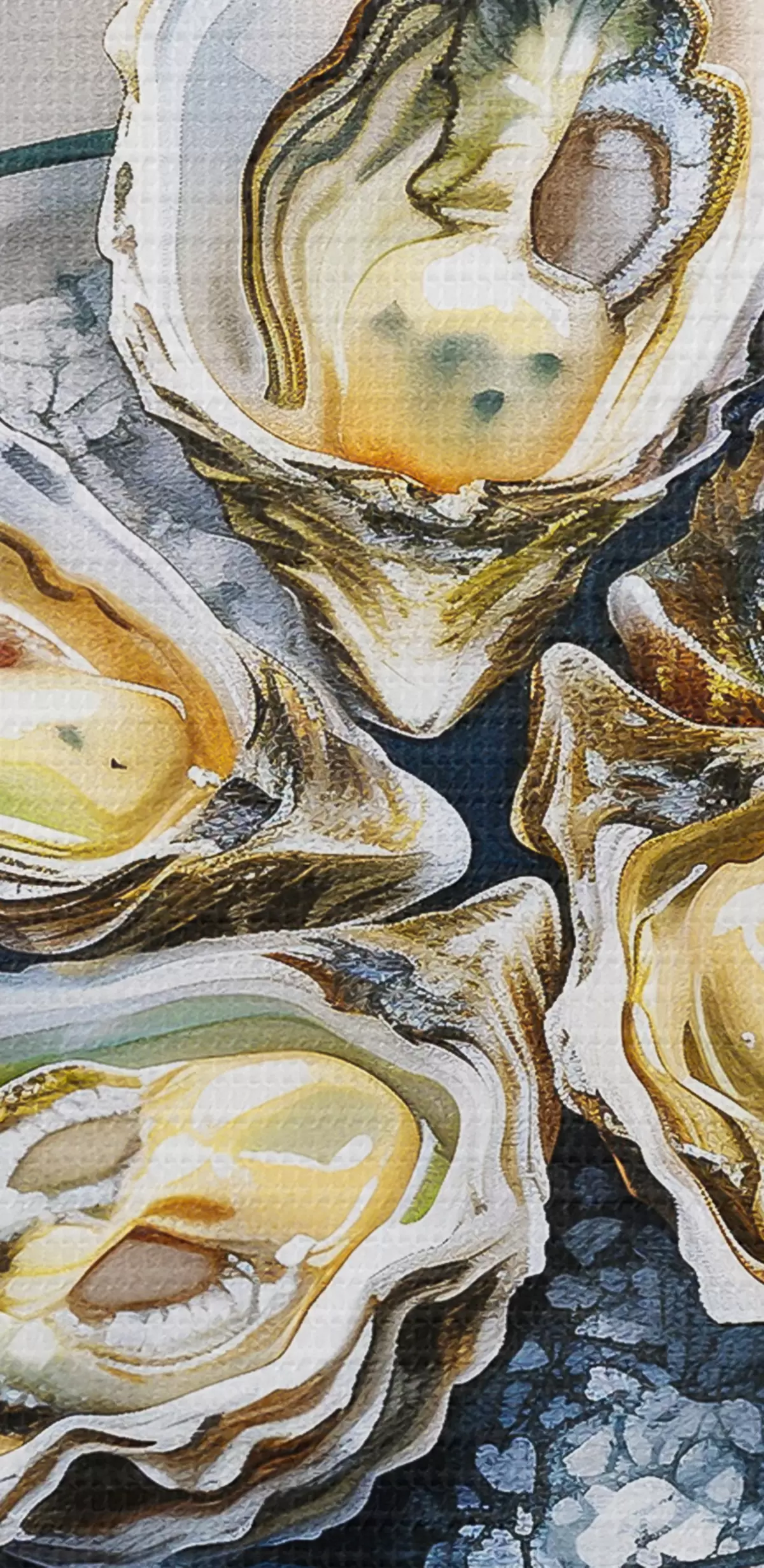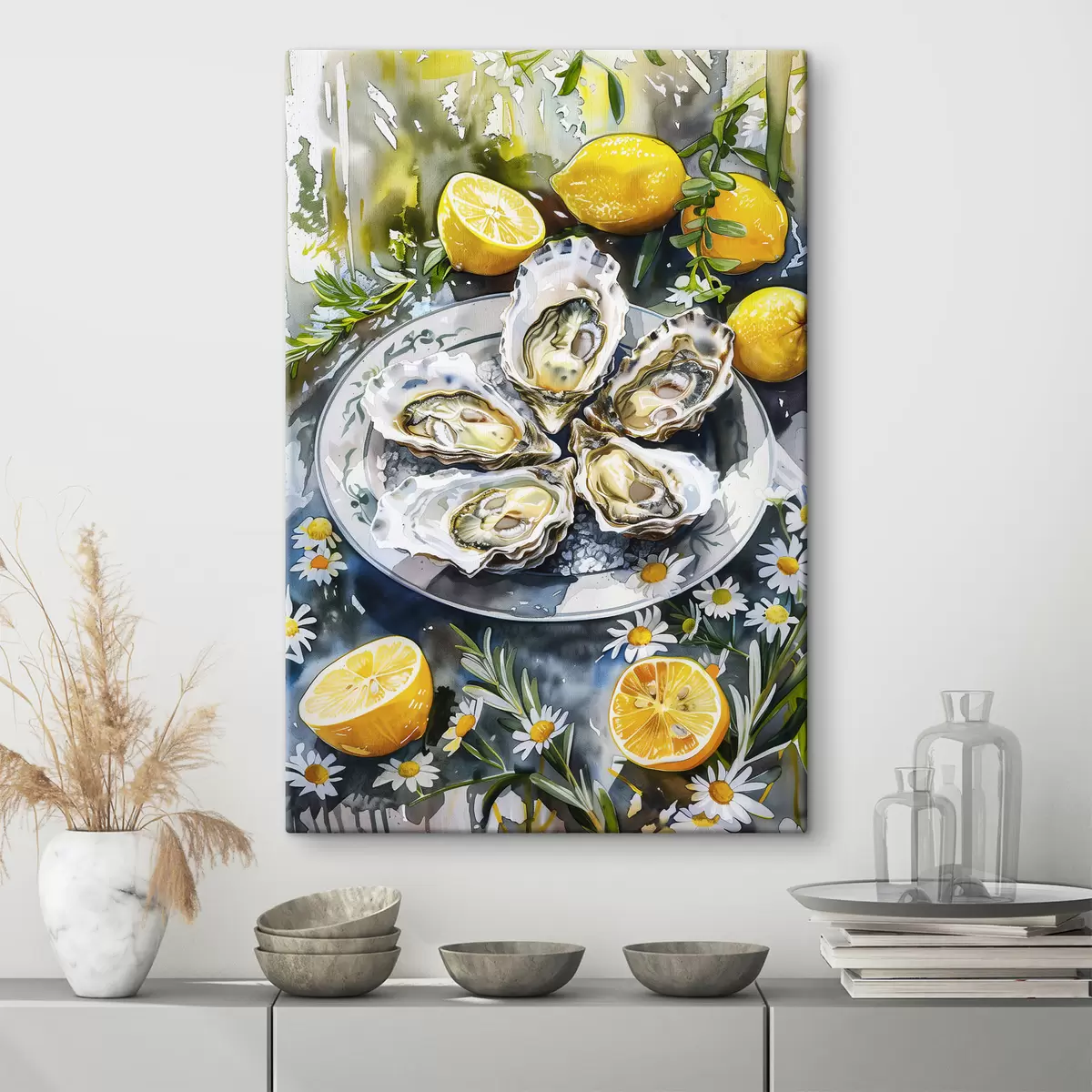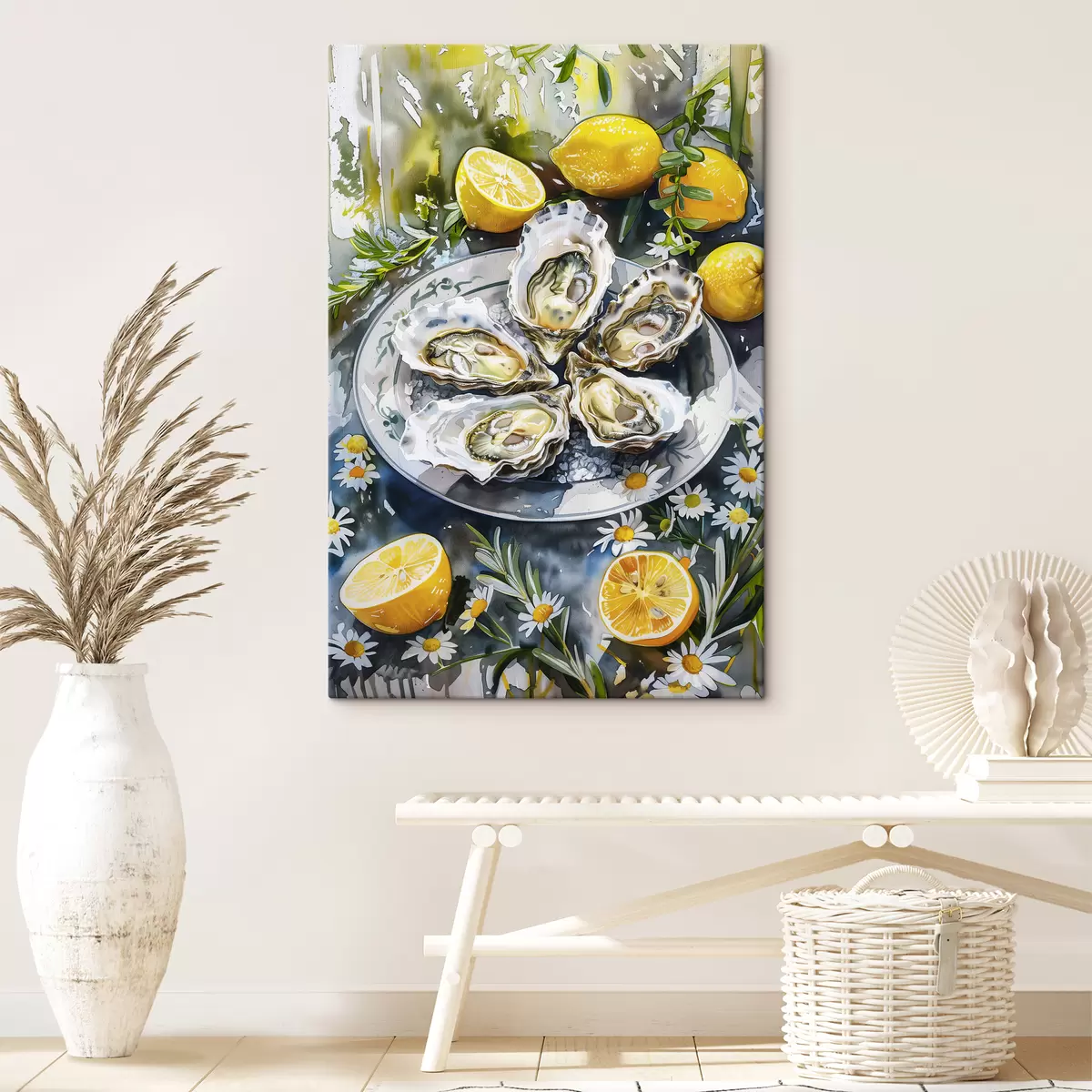 Tableau Huîtres élégantes dans l'assiette, citrons et fleurs, couleurs estivales, méditerranéennes s39710