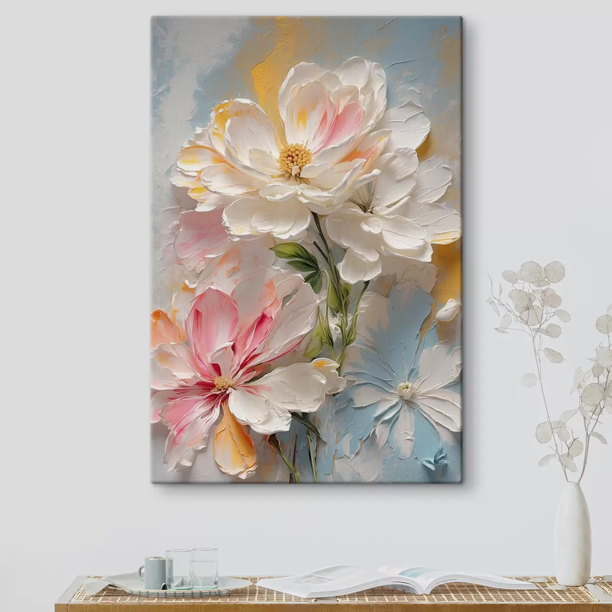 Trois types de matériaux peuvent être commandés : Economic Canvas - matériau dense et durable pour l'impression numérique, identique à la toile de peintre, surface imperméable, reproduction réaliste des détails, matériau à grain moyen. Premium Canvas - la texture ressemble à celle d'une toile de peintre (petits fils entrelacés). Reproduction douce et détaillée de l'image sur une surface mate. Eco-Premium - tissu 100 % coton de haute qualité. Grâce aux fibres naturelles de coton, le matériau est durable et résistant à l'usure. Excellente reproduction des couleurs et des détails.