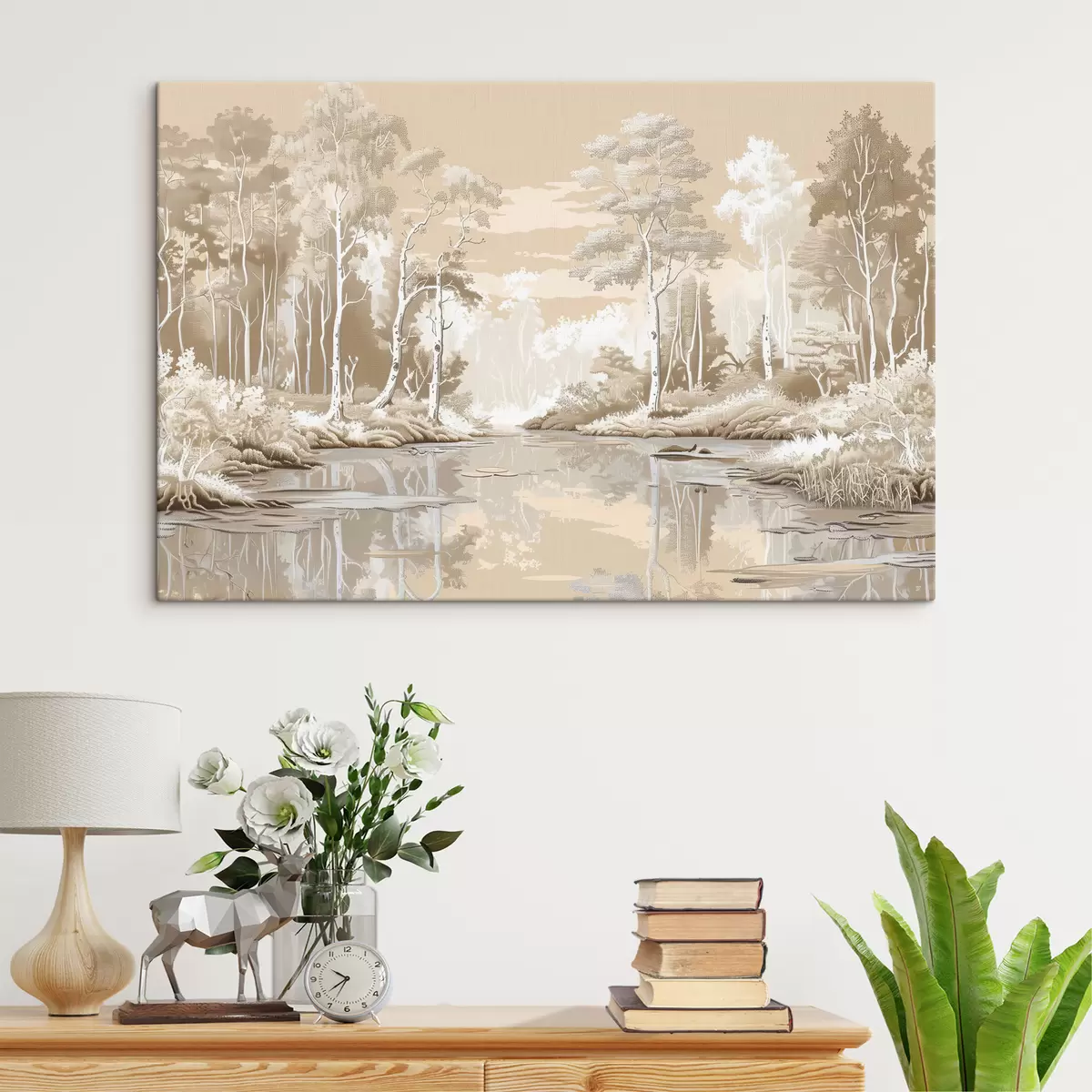 Tableau Magnifique paysage forestier, couleurs pastel douces, beige et blanc Nr s39978