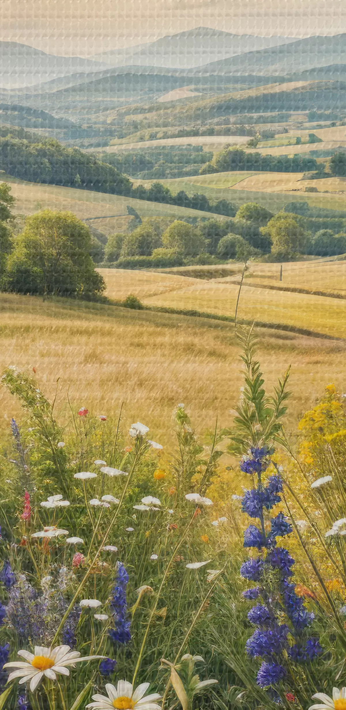 Tableau Un paysage de campagne luxuriant avec une prairie de fleurs sauvages vibrante remplie de fleurs colorées sous un ciel nuageux Nr s40018