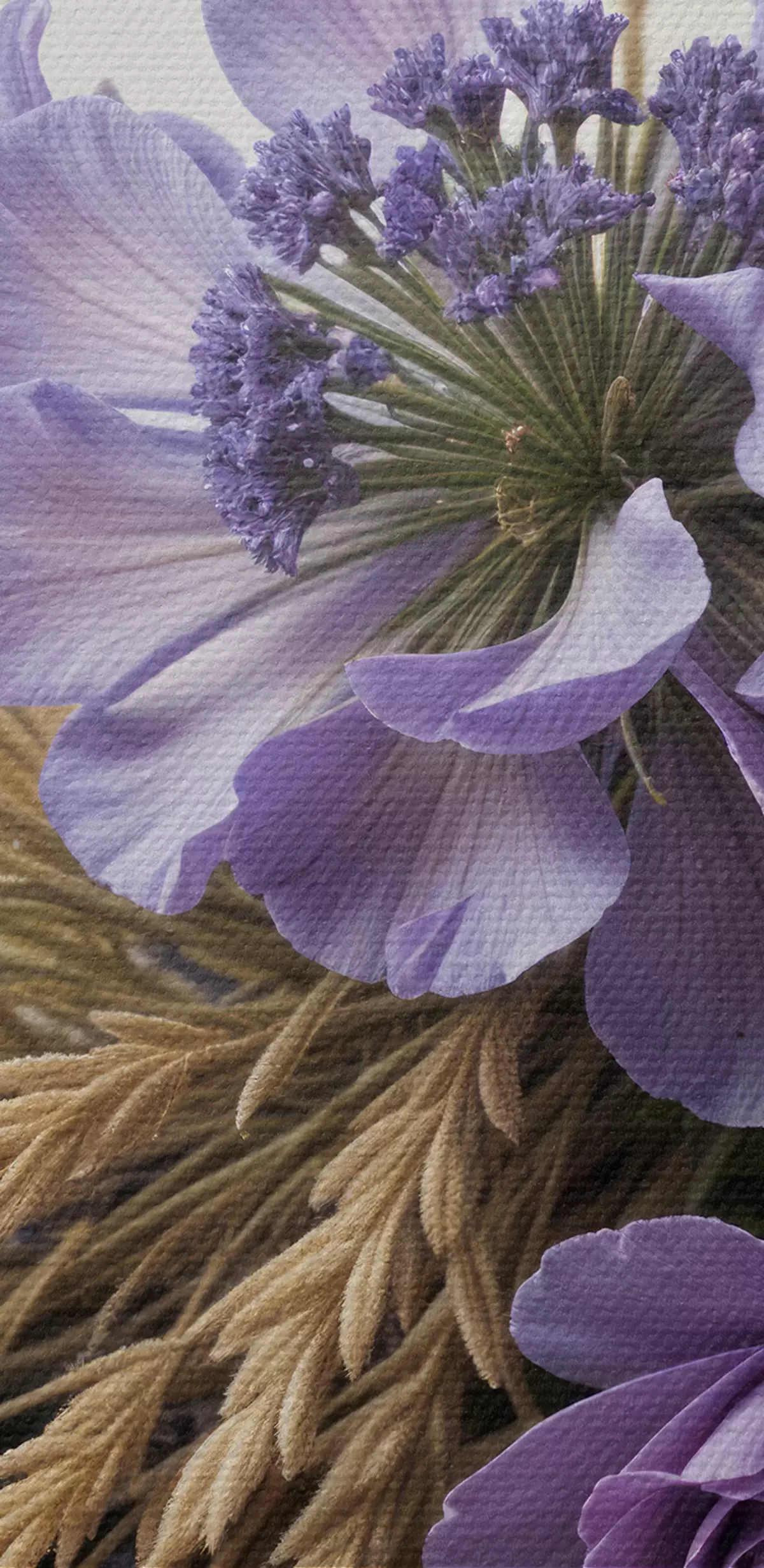 Tableau Un bouquet de fleurs violettes, dont des pivoines et de la lavande, avec des tiges de blé sur un fond clair Nr s40030
