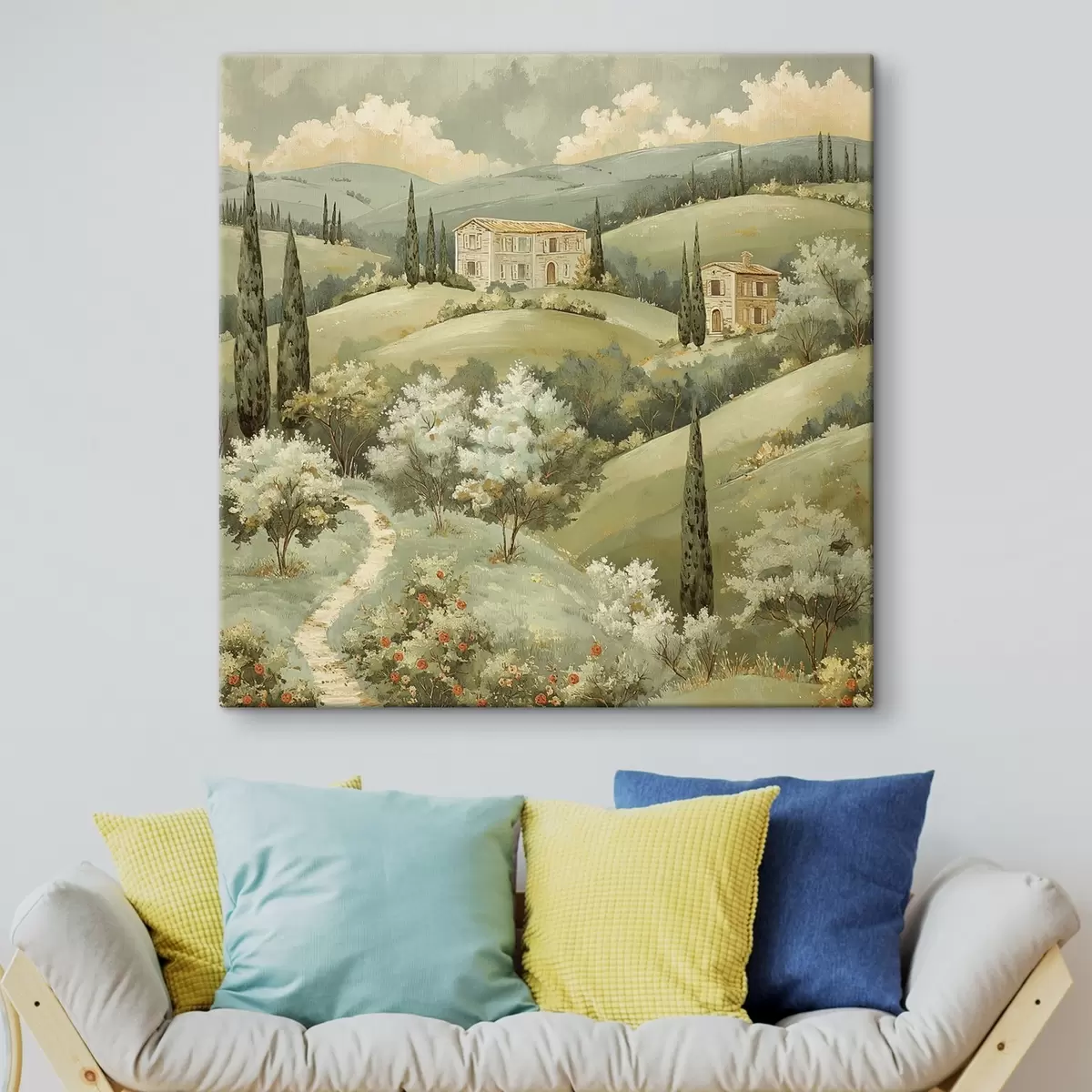 Tableau Paysage avec maisons anciennes, couleurs vert pastel, dessin acrylique, été s40078