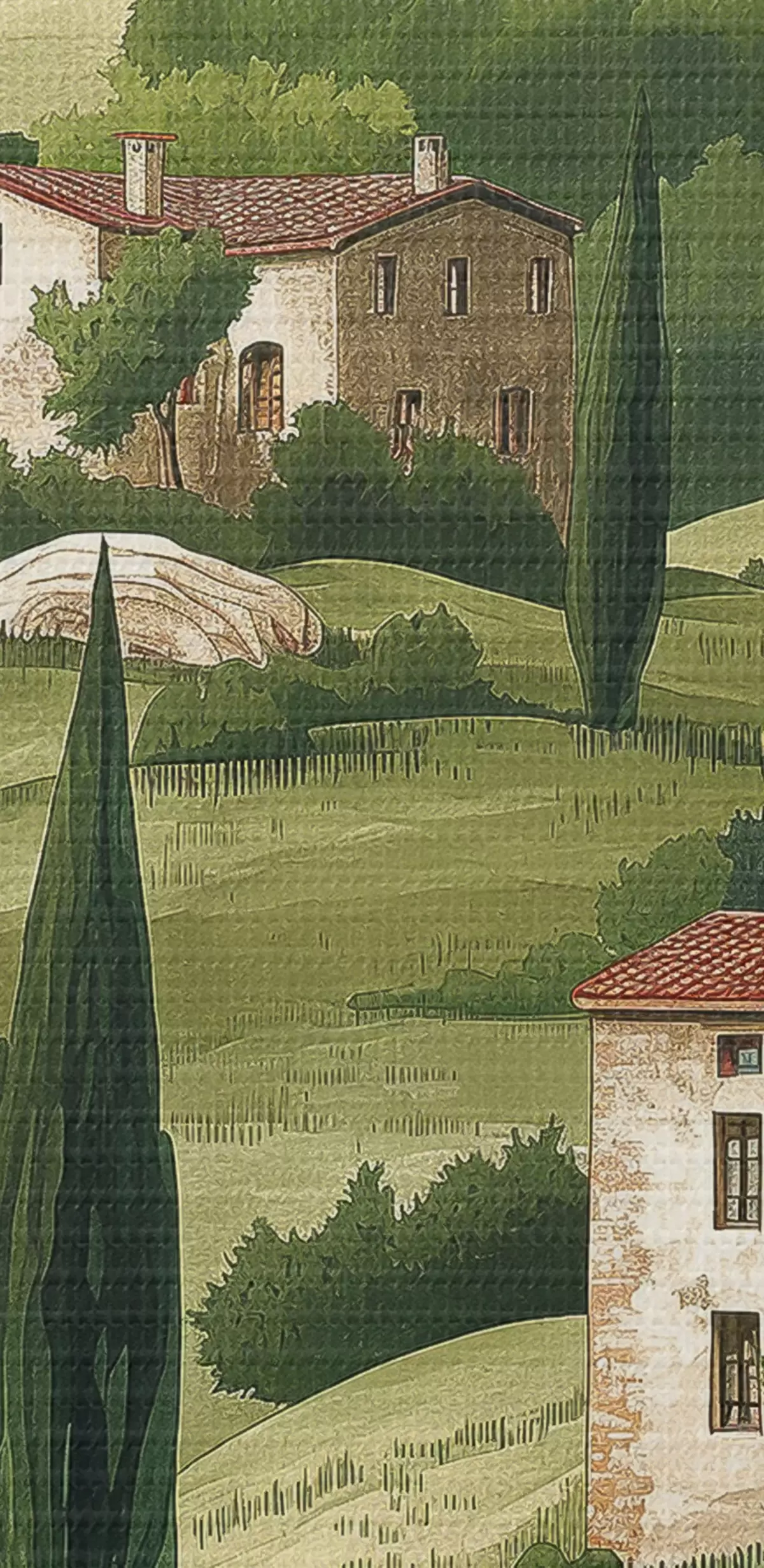 Tableau Paysage avec maisons anciennes, couleurs vert pastel, dessin acrylique, rustique s40080
