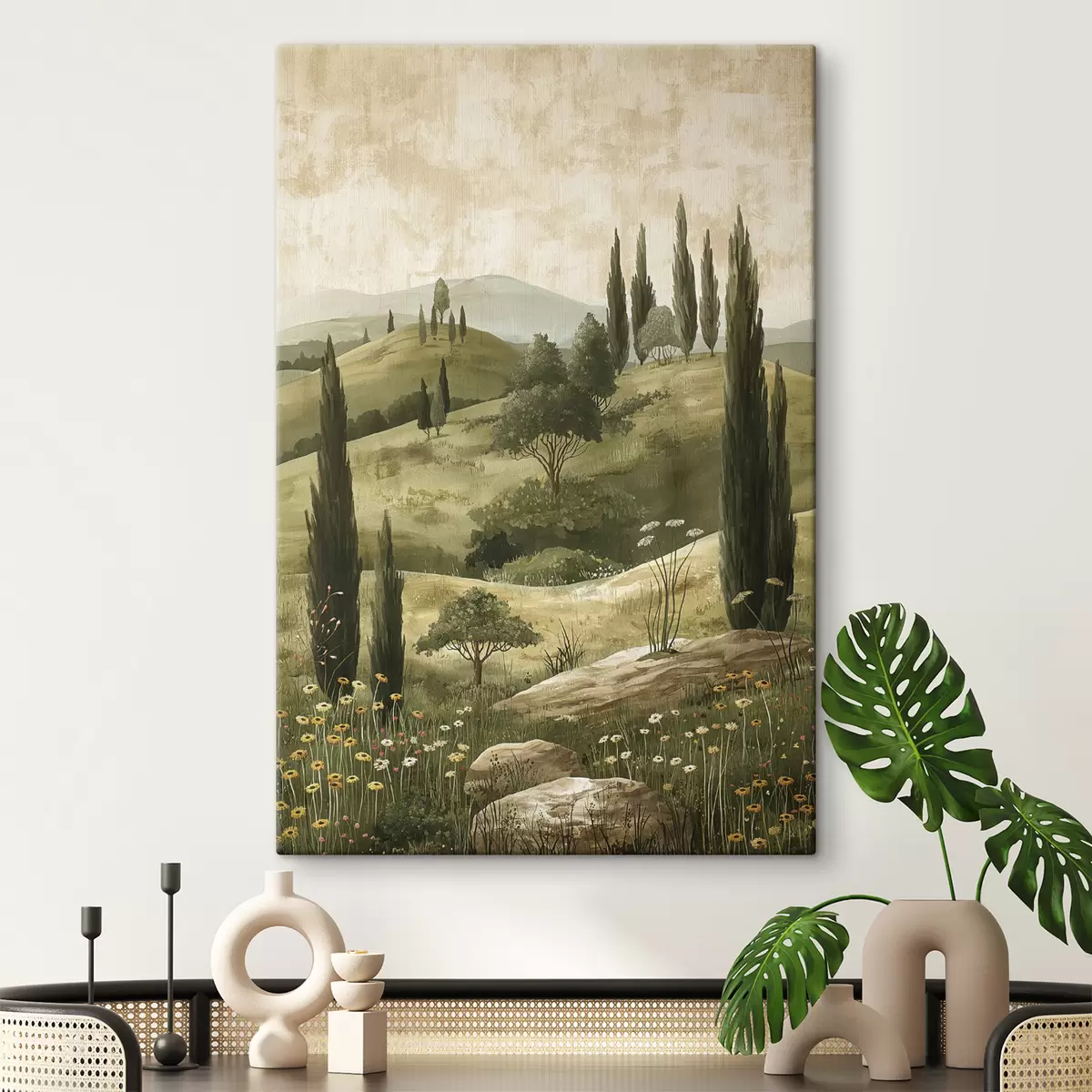 Tableau Paysage vintage, style rustique, couleurs pastel, prairie avec fleurs et arbres s40081