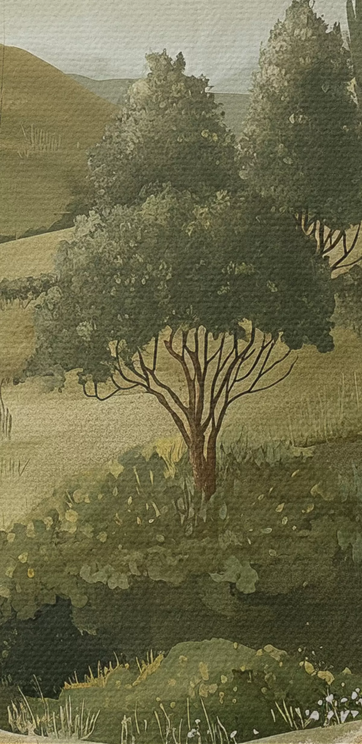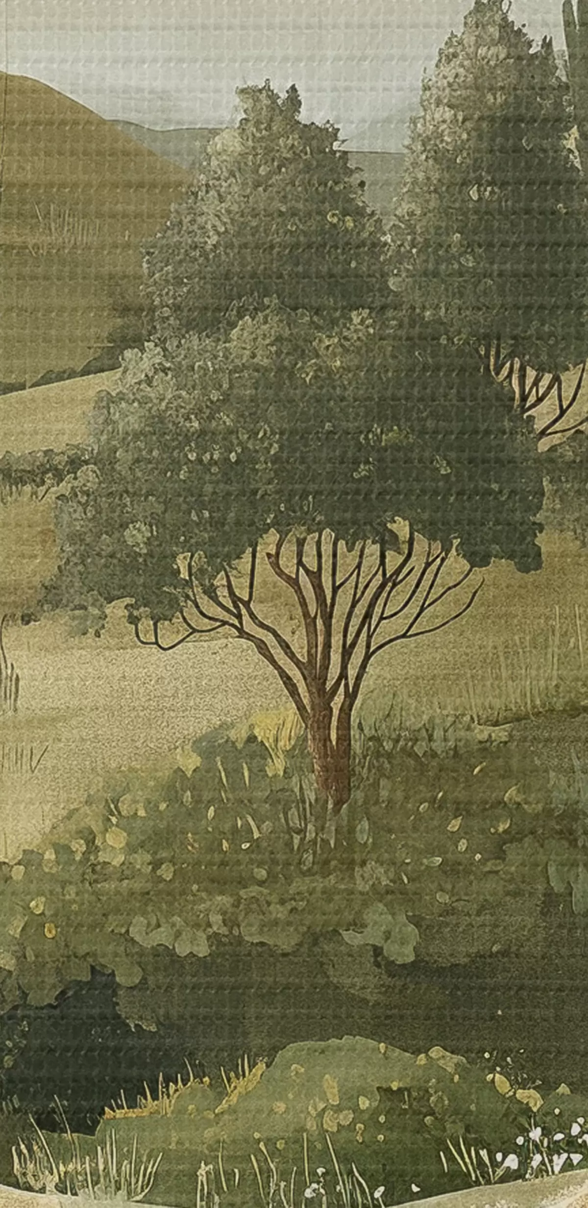 Tableau Paysage vintage, style rustique, couleurs pastel, prairie avec fleurs et arbres Nr s40081