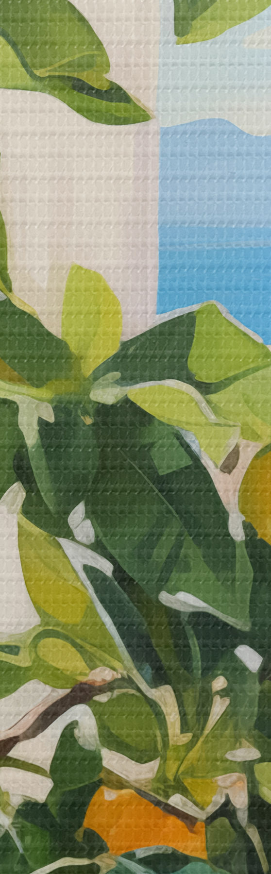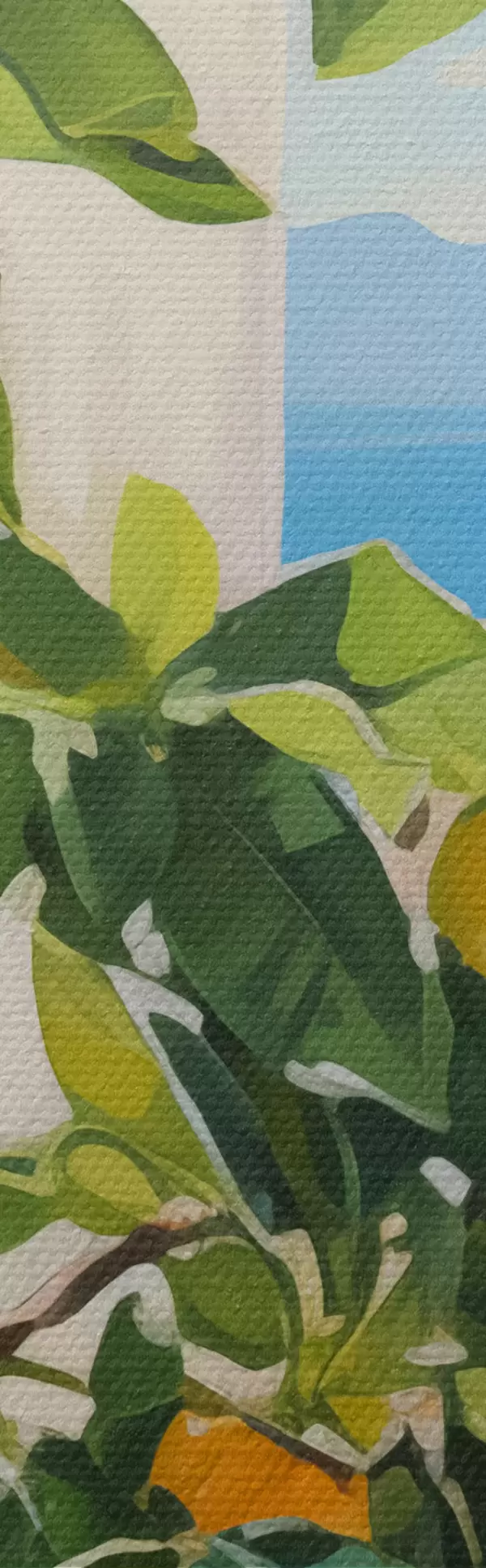 Tableau Citrons sur un arbre et une table sur un balcon d'hôtel avec vue sur la mer, imitation peinture à l'huile s40091
