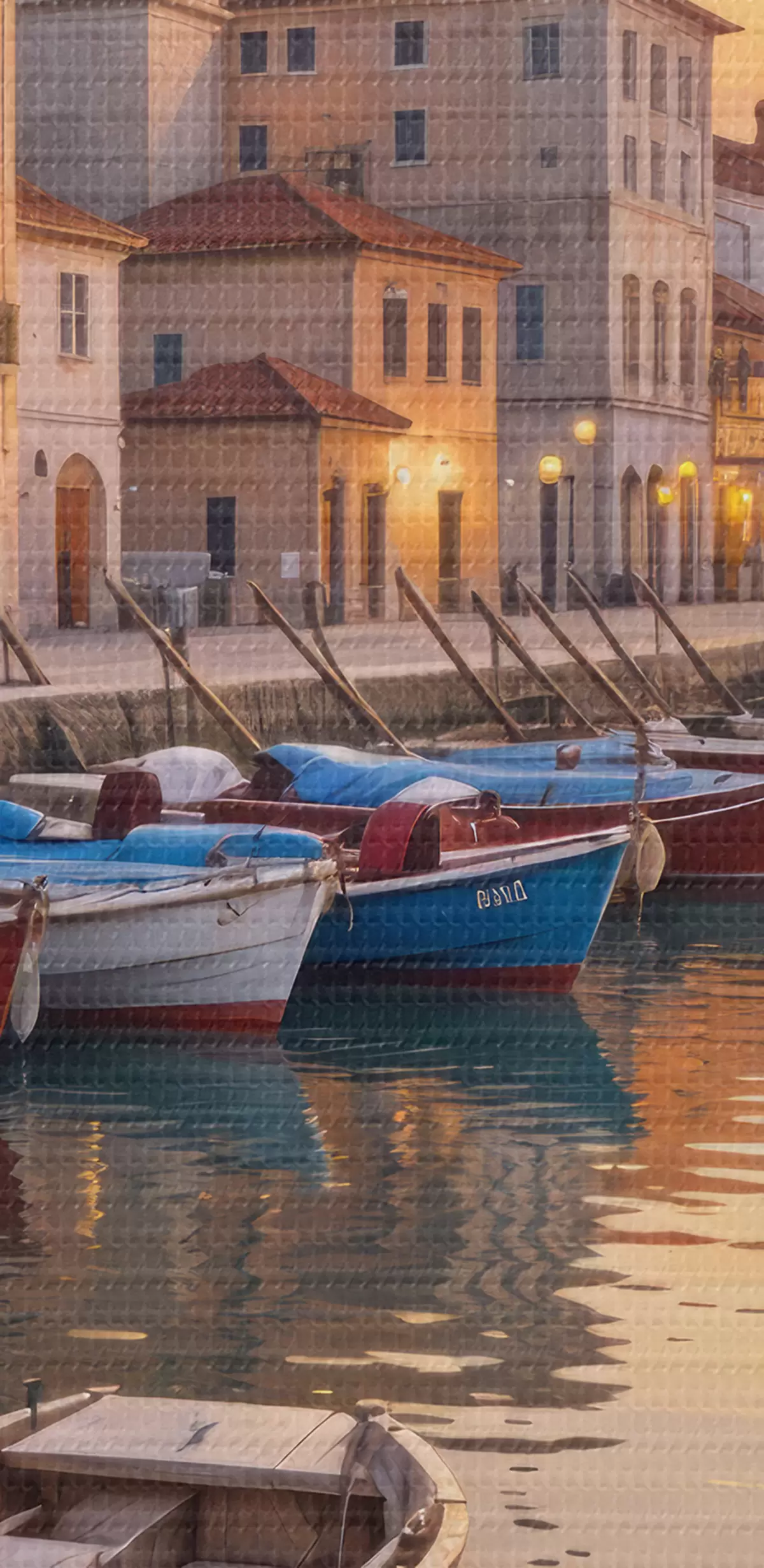 Tableau Ville côtière italienne au coucher du soleil, avec des bâtiments colorés bordant le front de mer et des bateaux flottant dans les eaux calmes Nr s40150