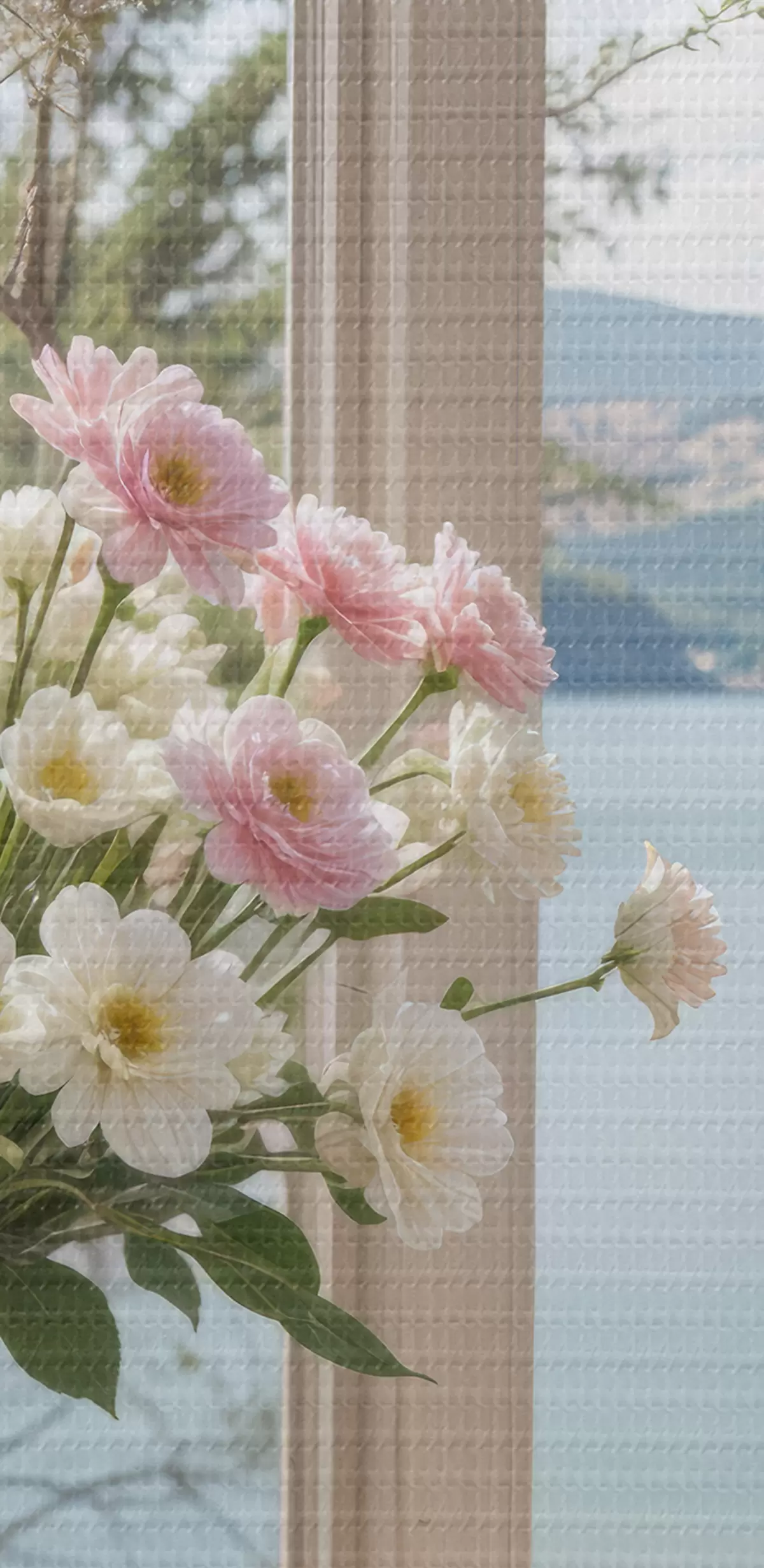 Tableau Un bouquet de fleurs roses et blanches dans un vase en verre placé sur un rebord de fenêtre, avec un lac et des montagnes pittoresques  s40151