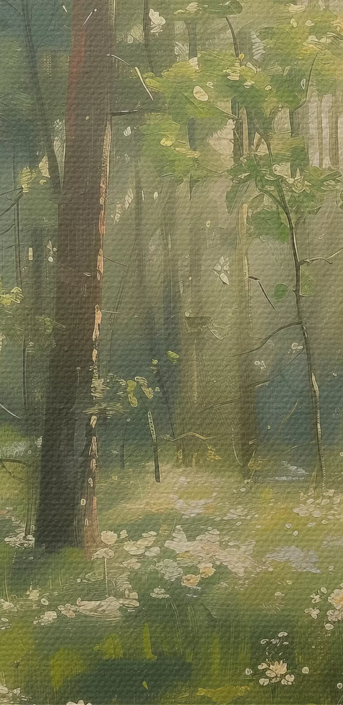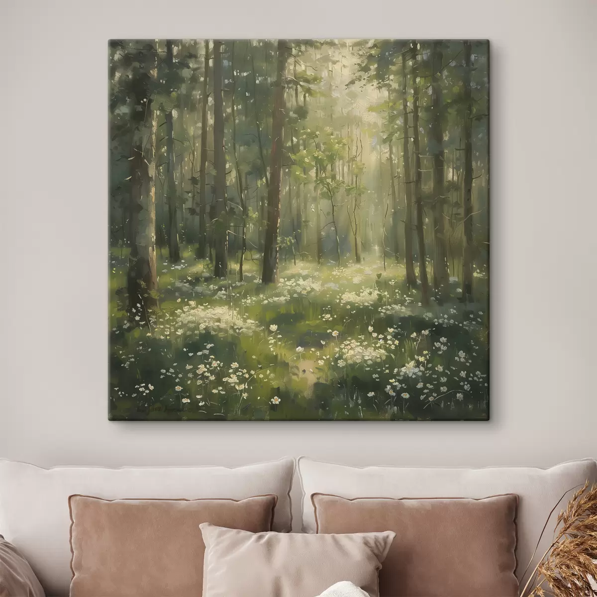 Tableau Forêt avec soleil dans les arbres, fleurs de camomille, herbe verte, dessin acrylique s40226