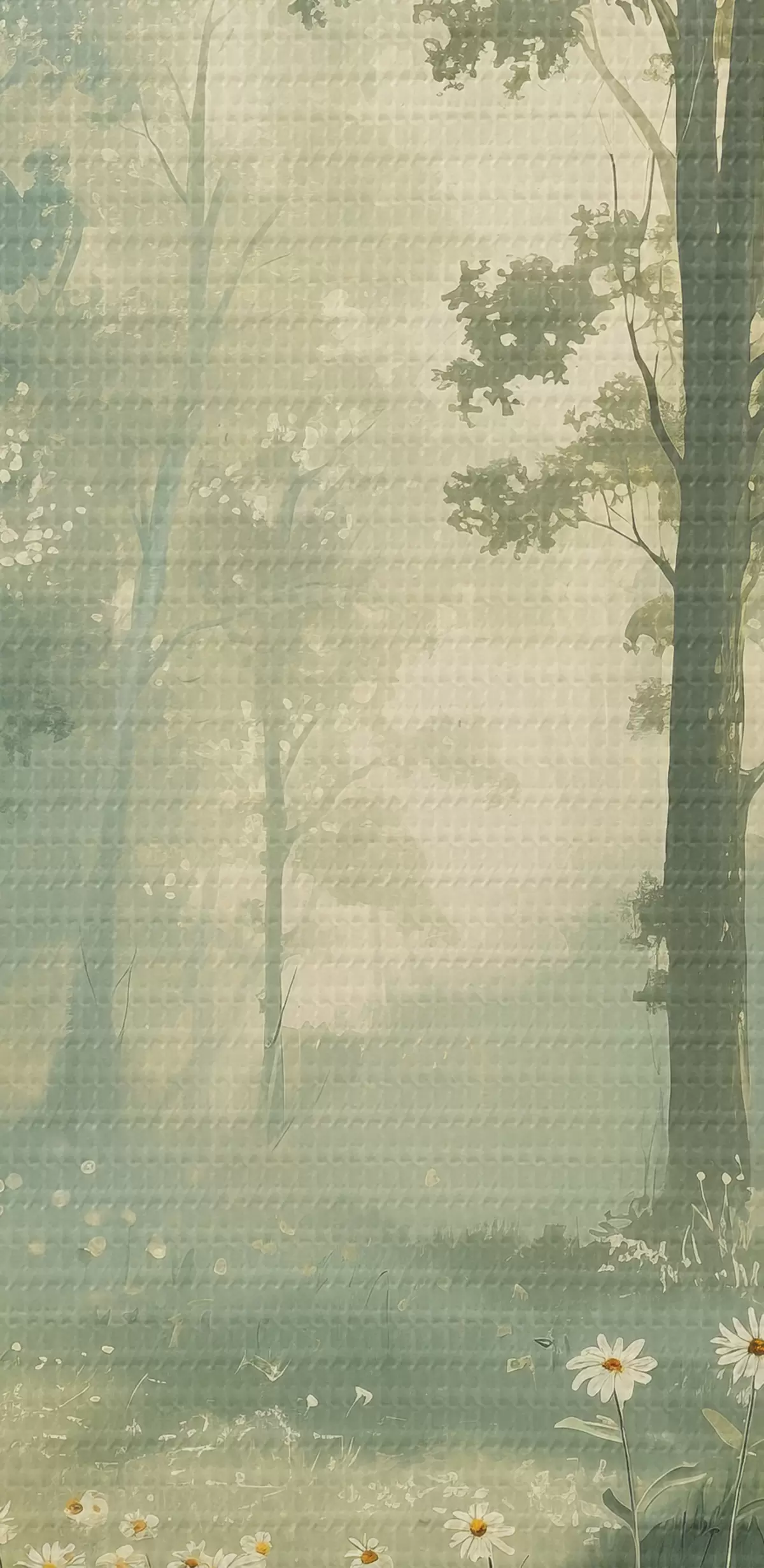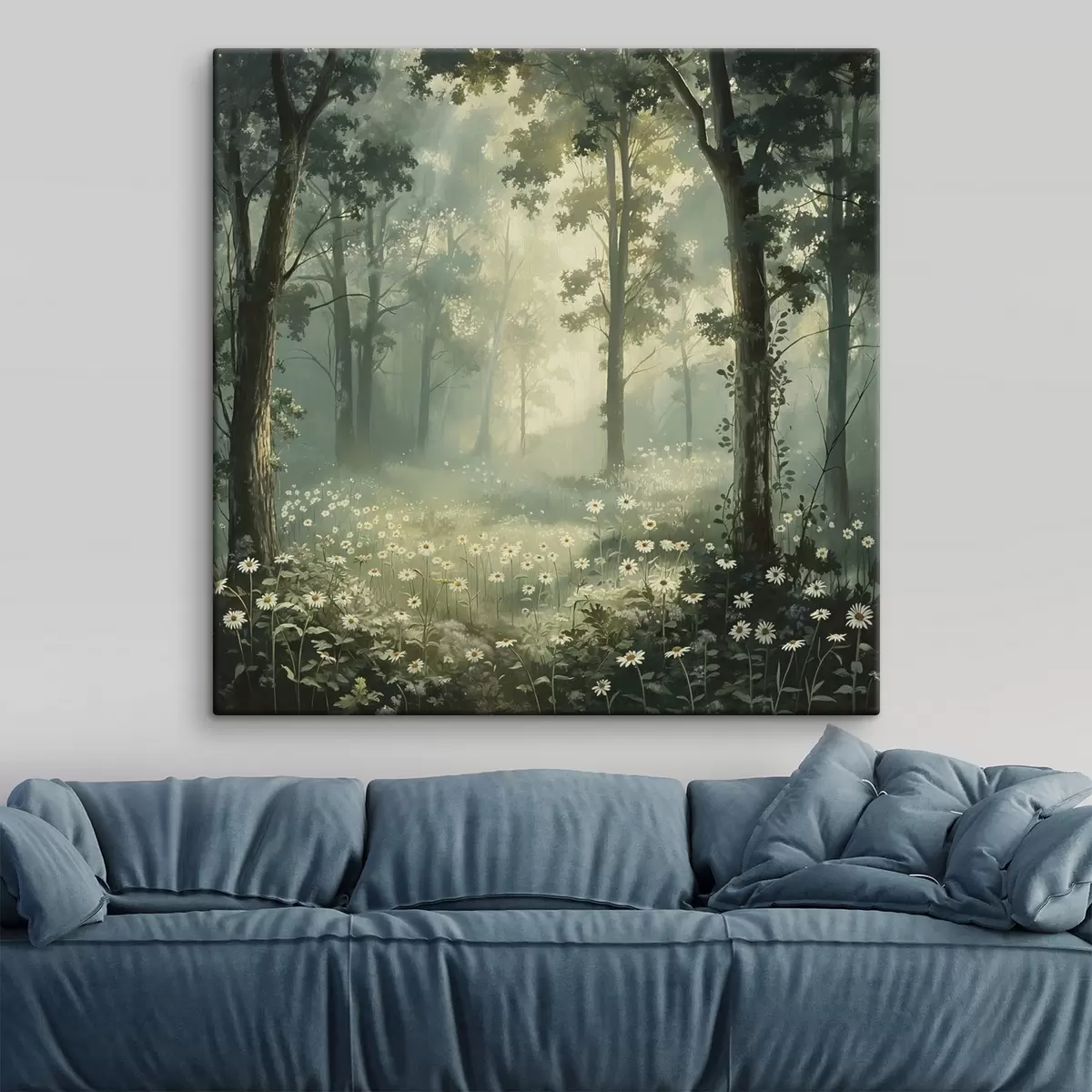 Tableau Forêt avec une douce lumière du soleil, fleurs de camomille, arbres, herbe verte, dessin acrylique s40228