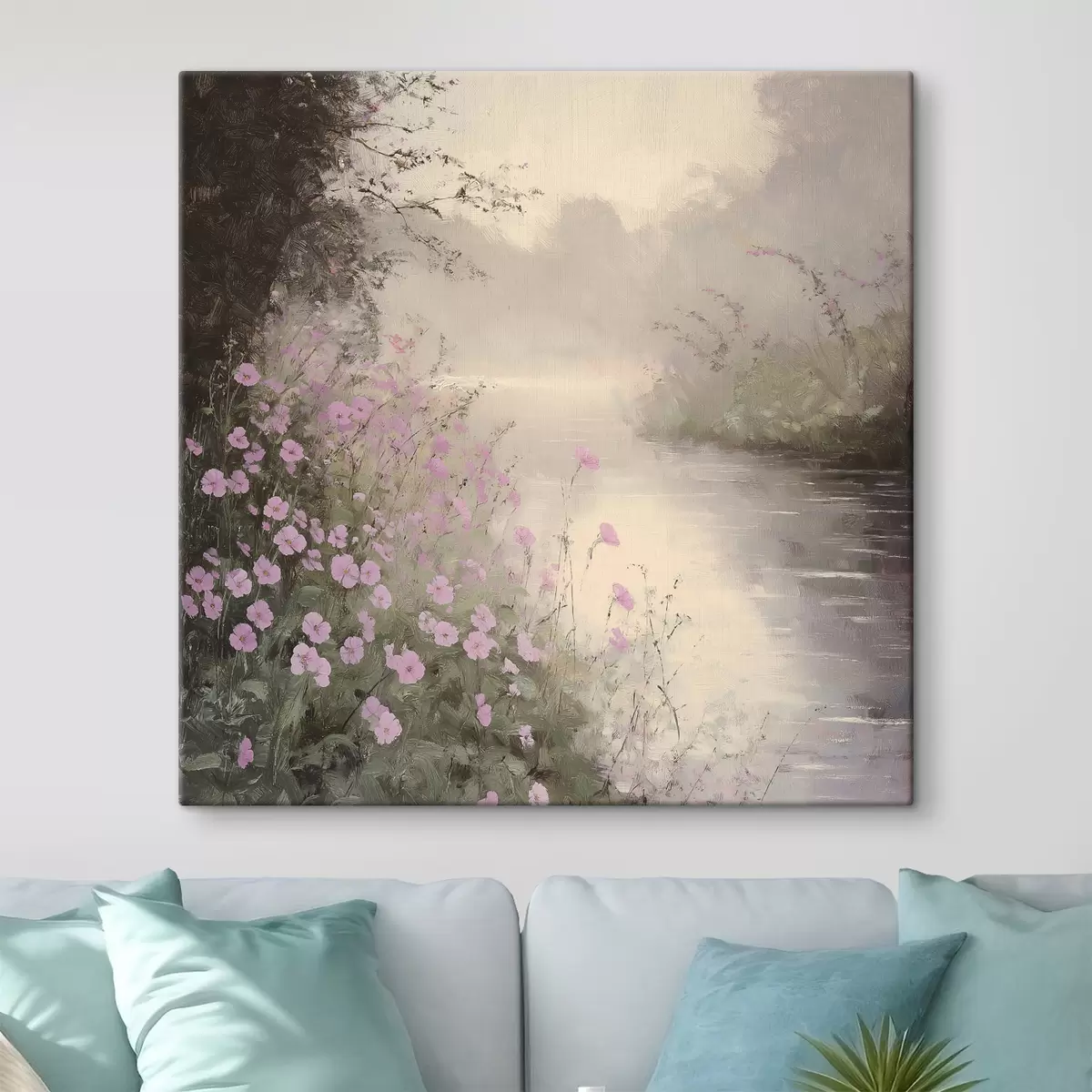 Tableau Lac aux fleurs roses, lever de soleil, dessin à l'huile, couleurs beige pastel, brume Nr s40229