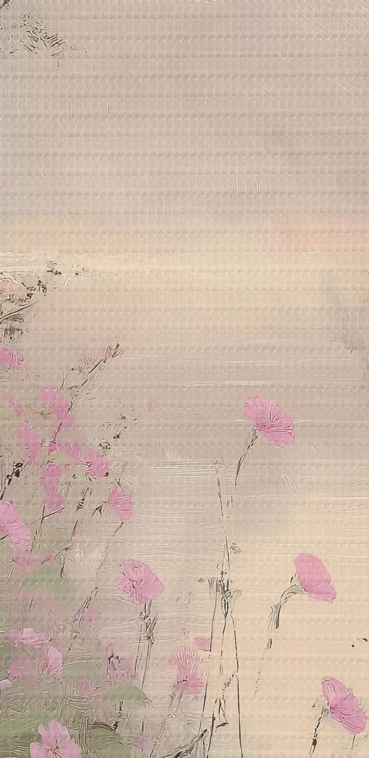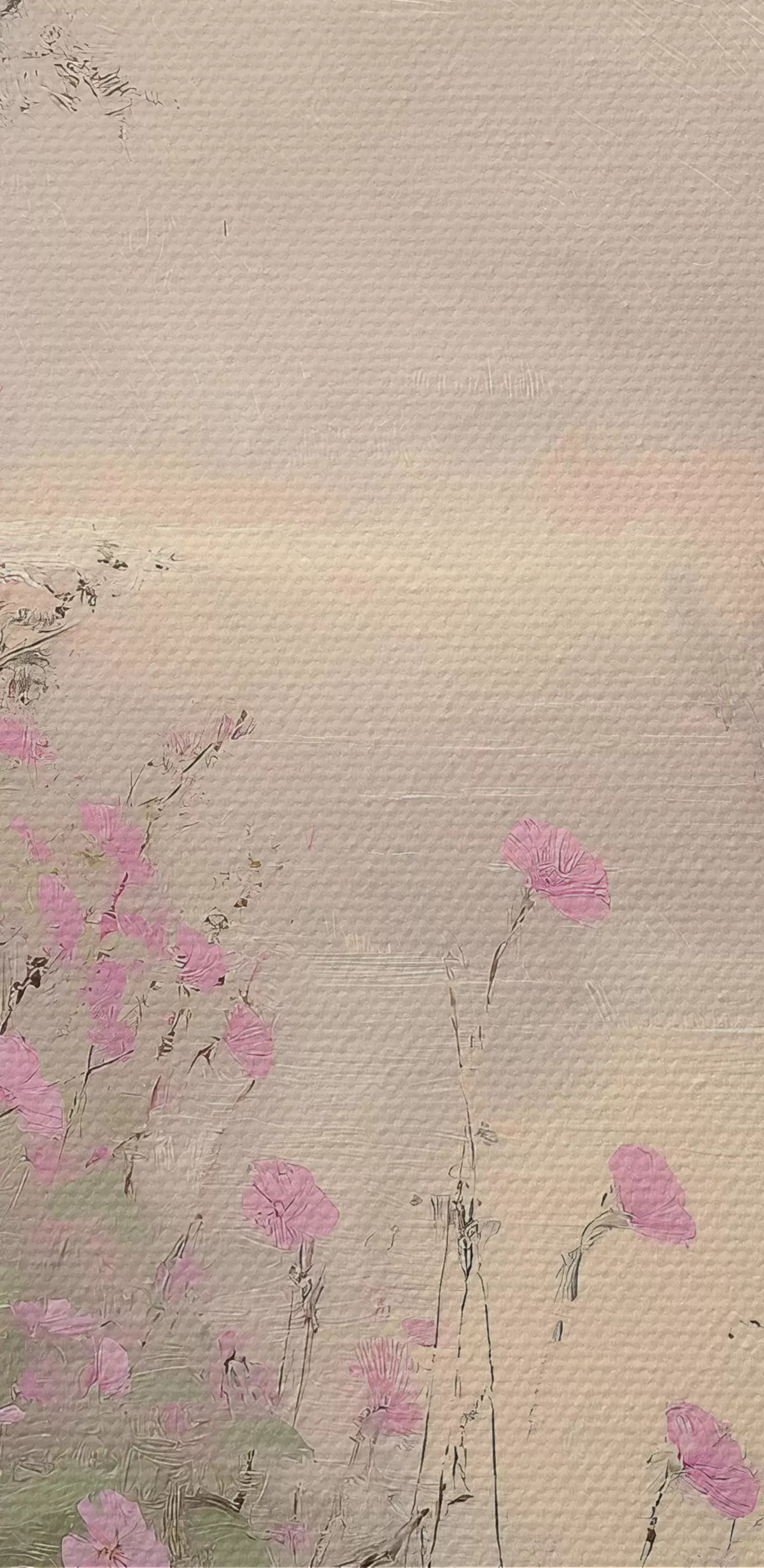 Tableau Lac aux fleurs roses, lever de soleil, dessin à l'huile, couleurs beige pastel, brume s40229