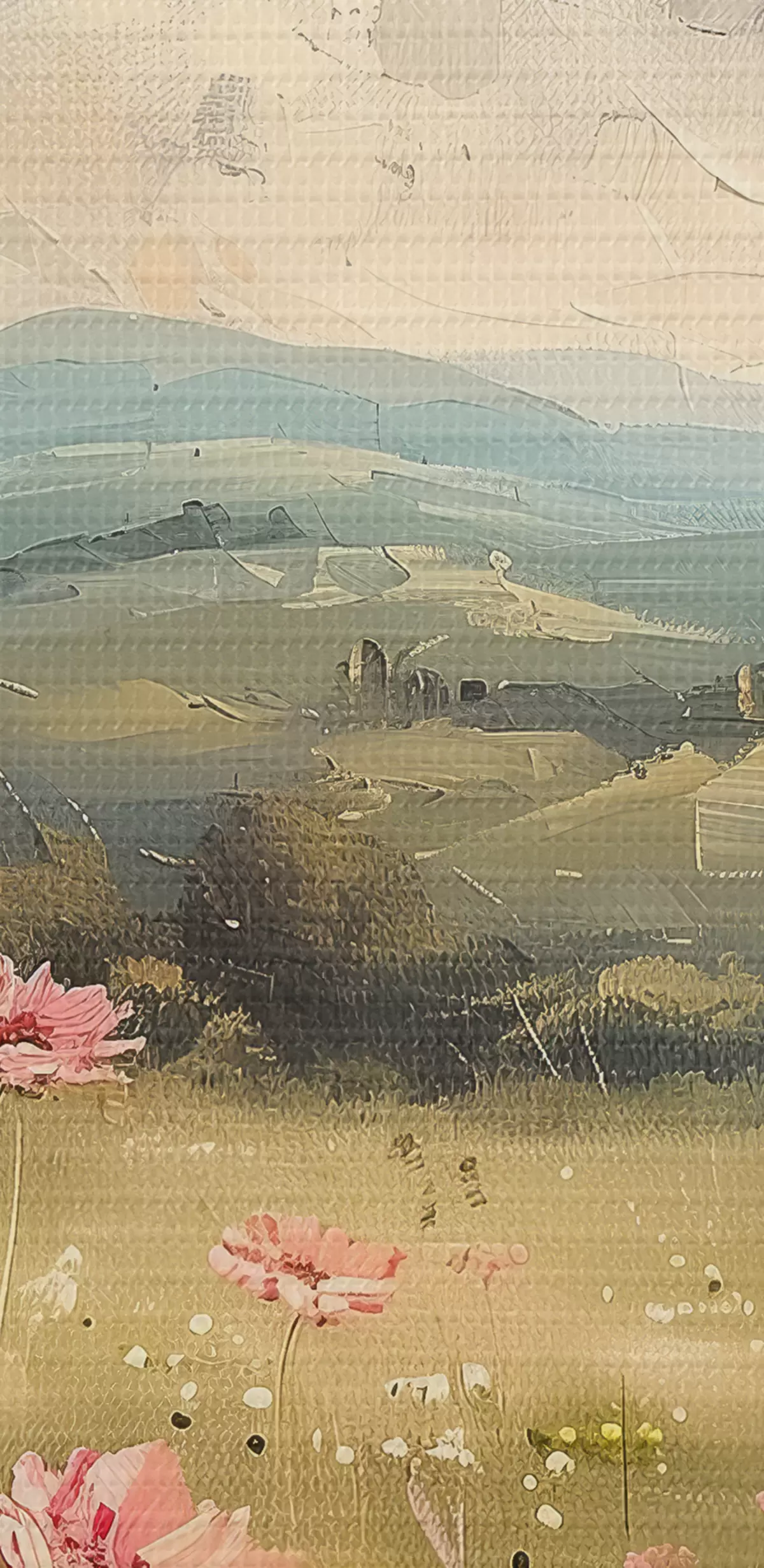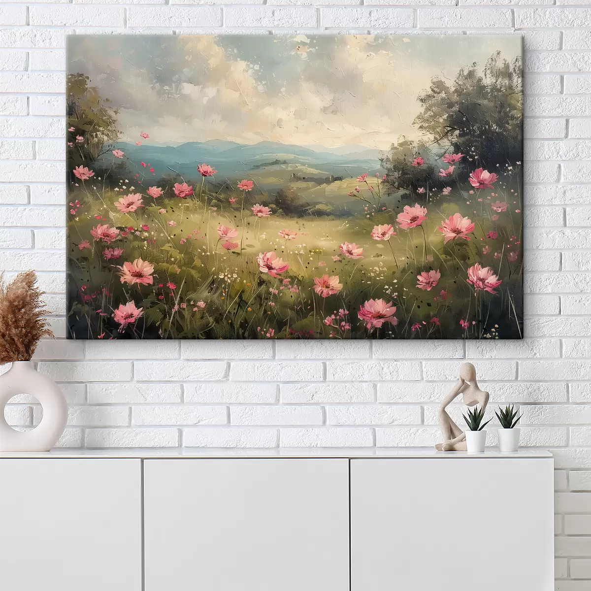 Tableau Prairie avec des fleurs roses, herbe verte, paysage naturel, ciel avec nuages, dessin acrylique s40234