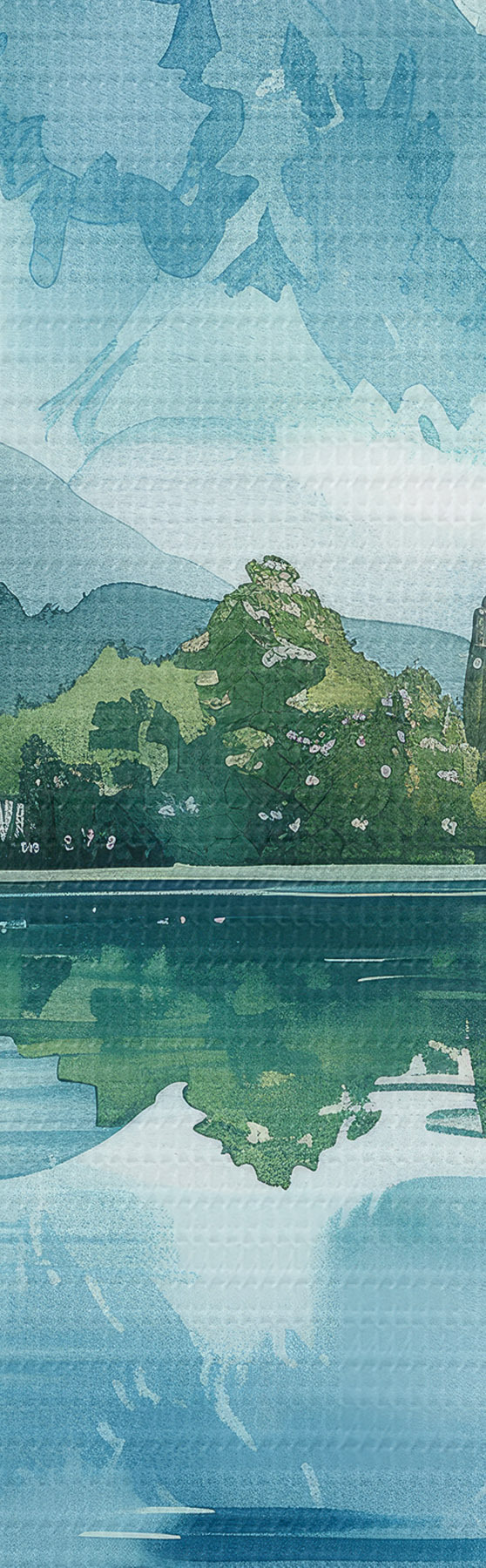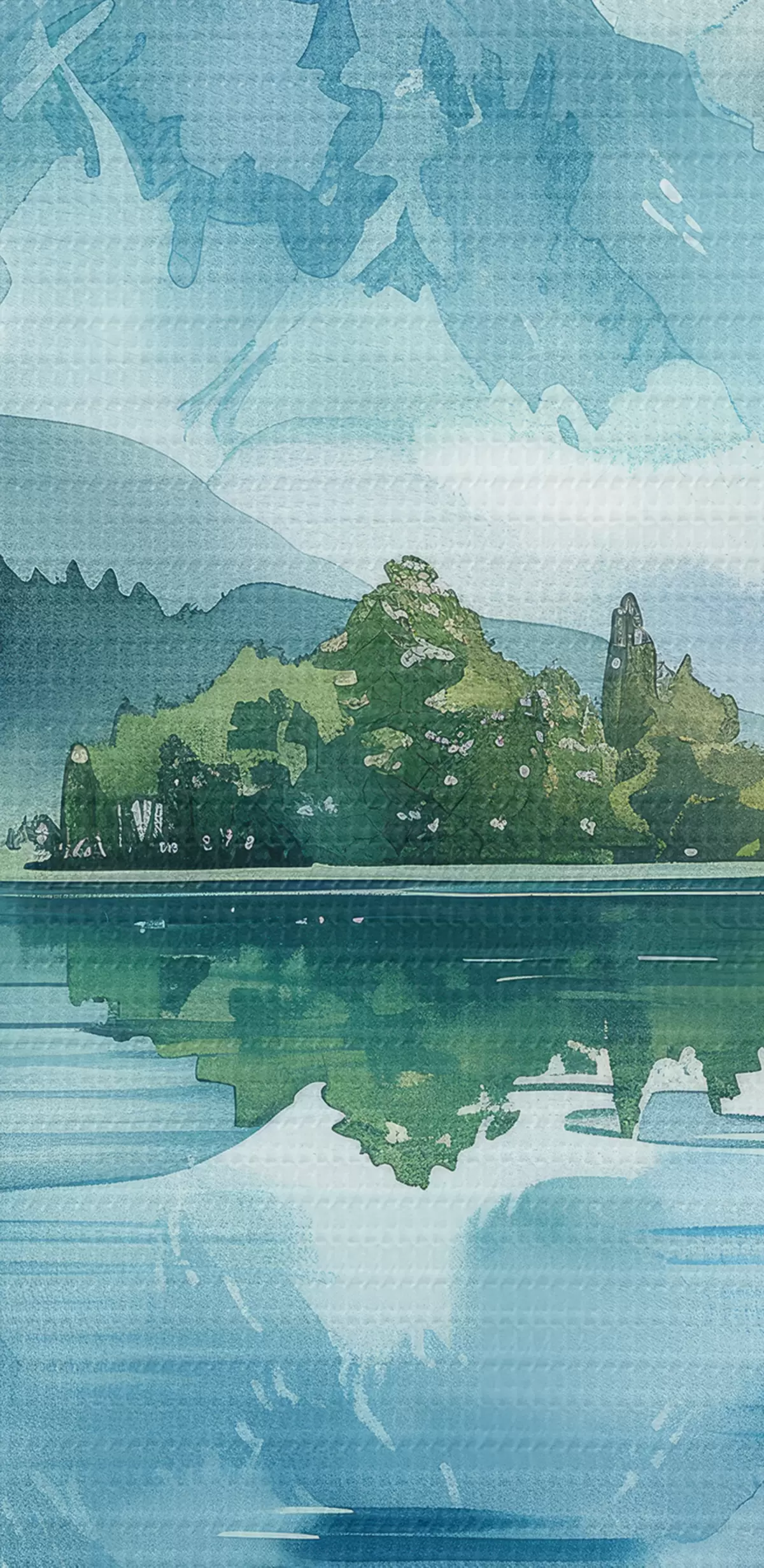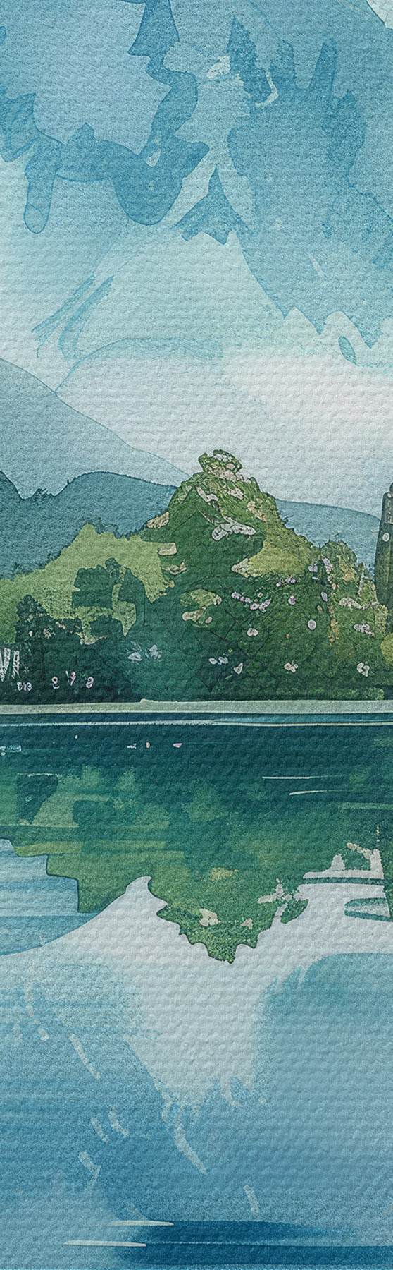 Tableau Aquarelle paysage de montagnes, rivière, couleurs vertes et bleues Nr s40310