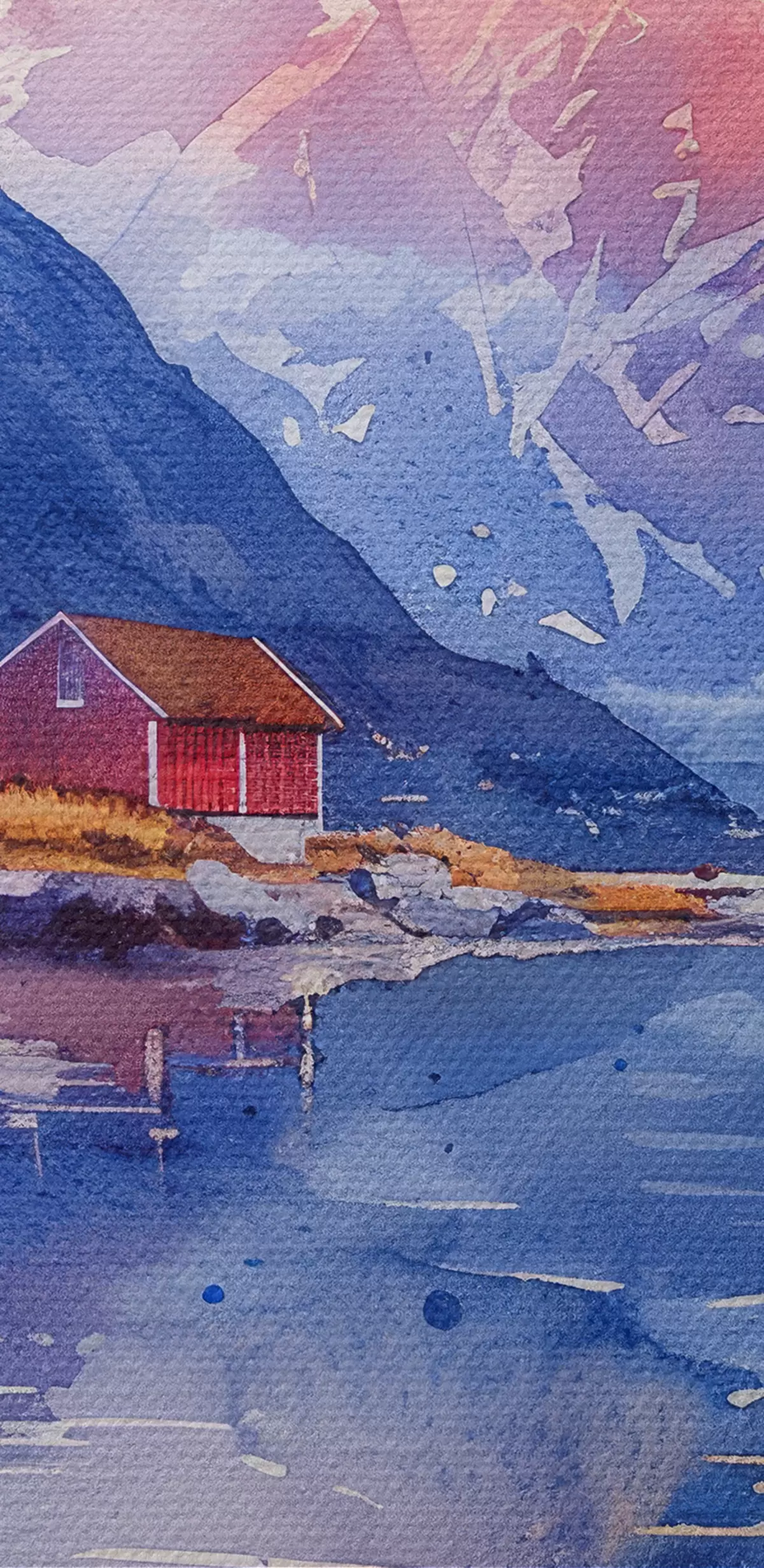 Tableau Village norvégien, ciel couchant, rivière calme, montagnes, aquarelle s40311