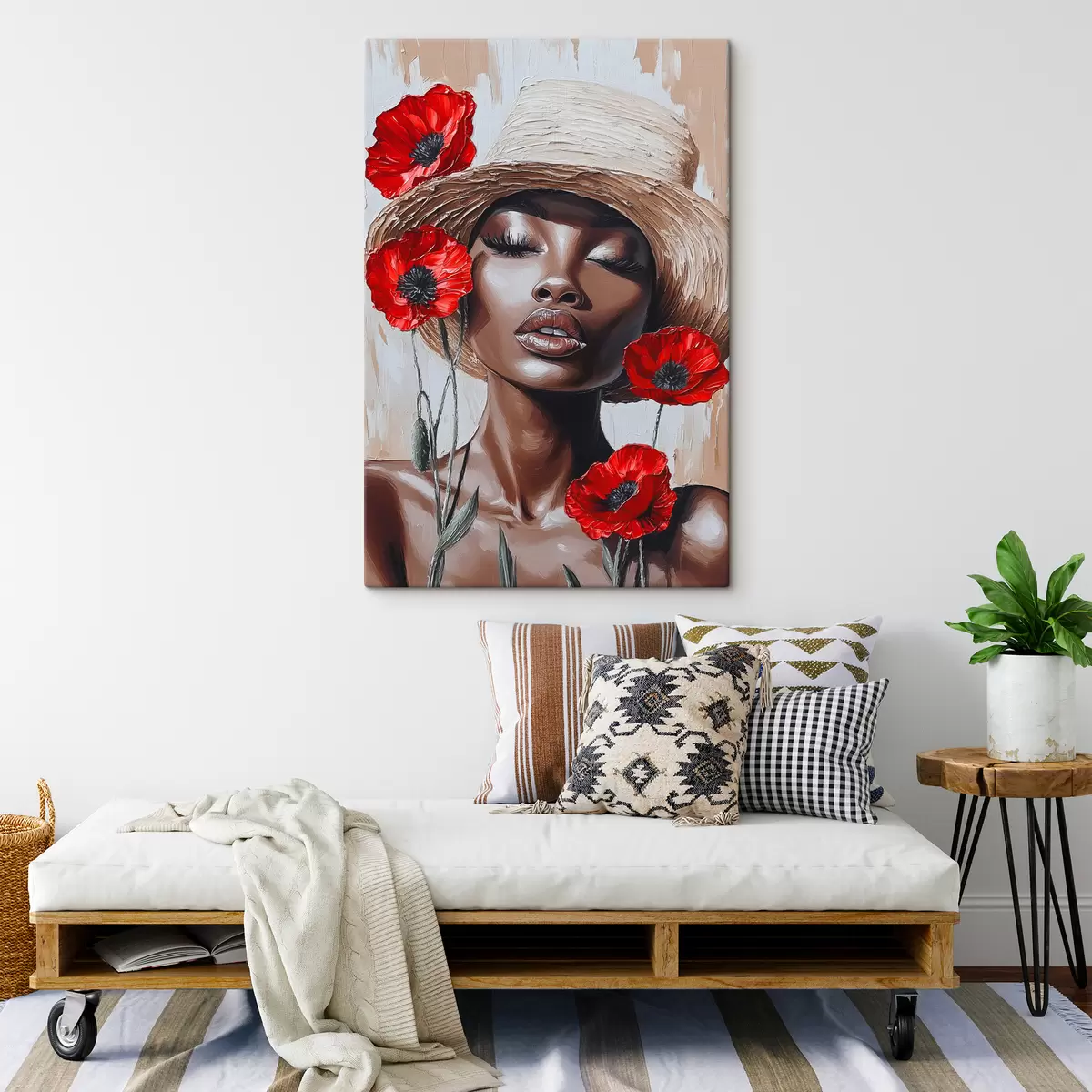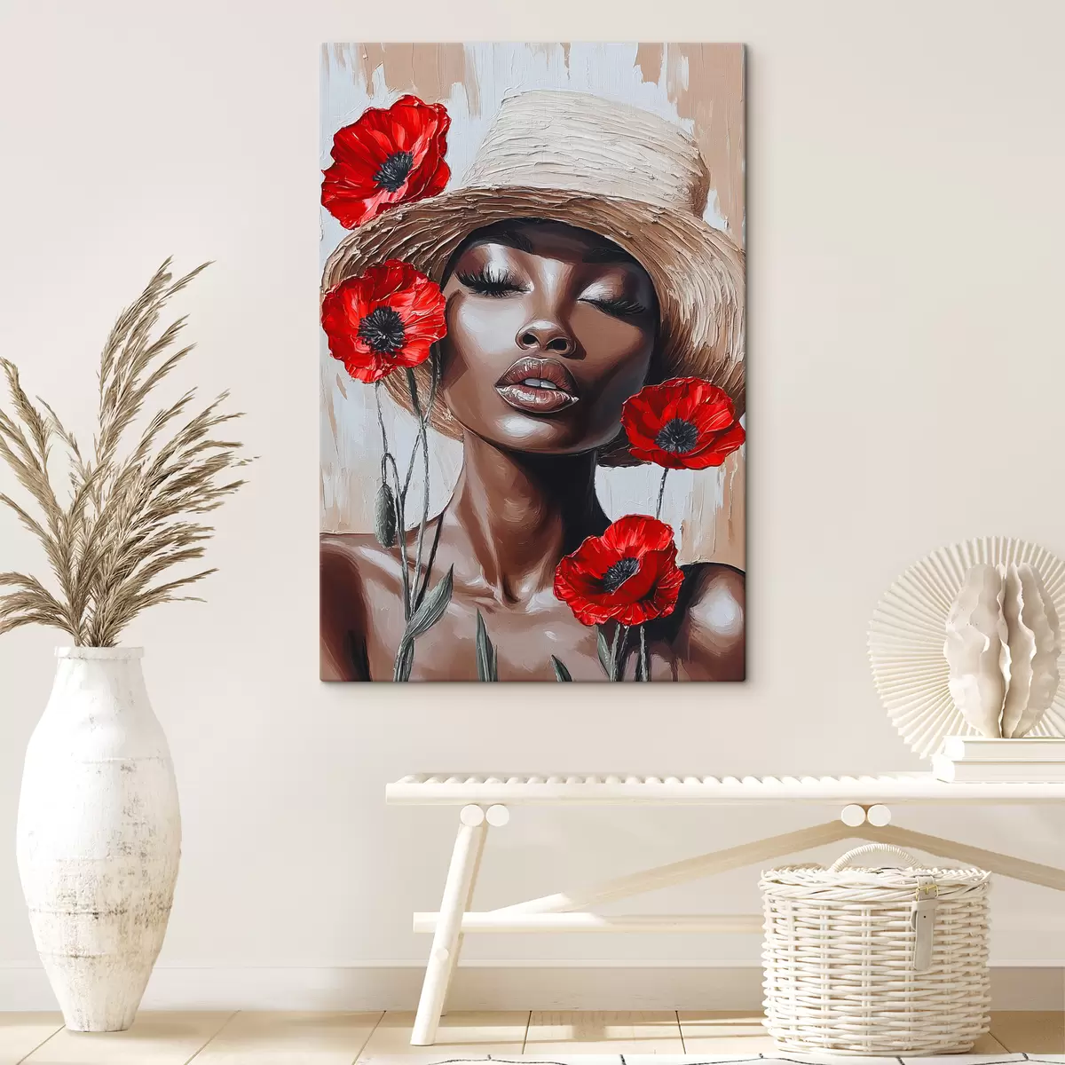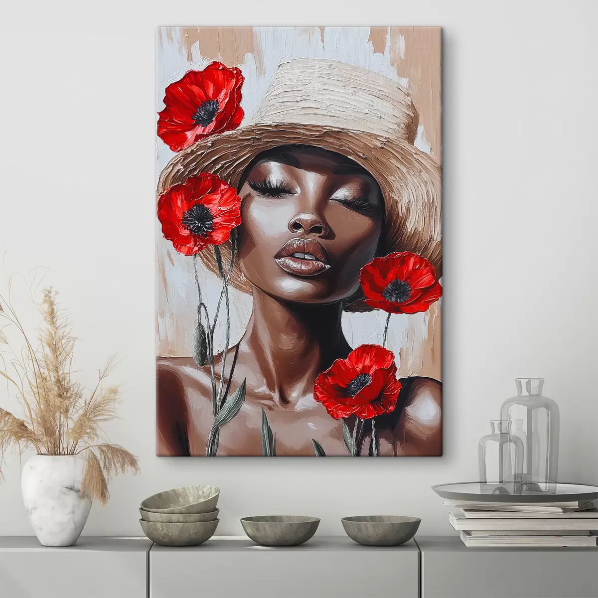 Tableau Portrait d'une femme au chapeau avec des coquelicots rouges s40350