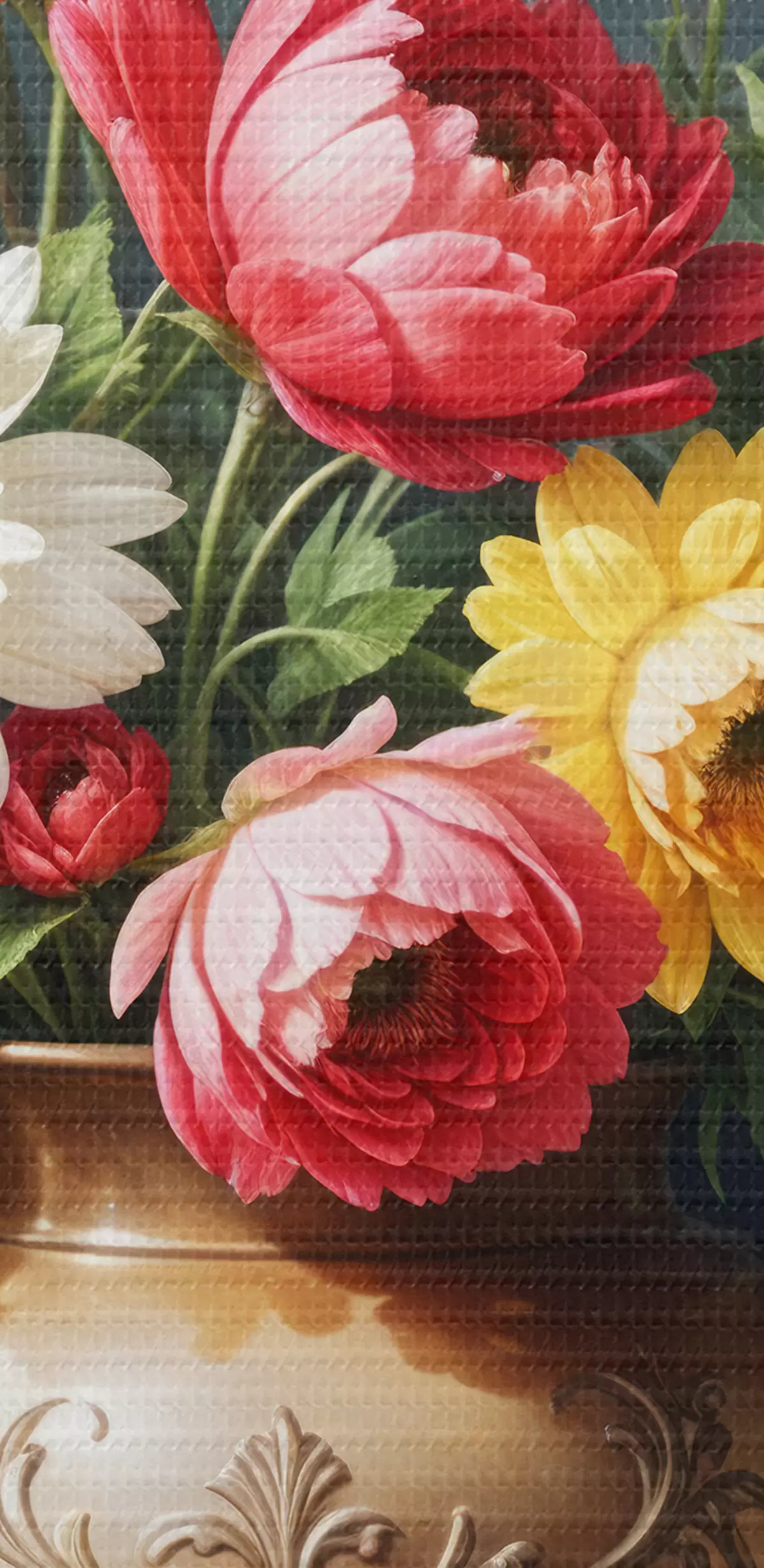 Tableau Une peinture vibrante d'un bouquet de fleurs colorées comprenant des roses rouges, des jonquilles jaunes et des marguerites blanches Nr s40395