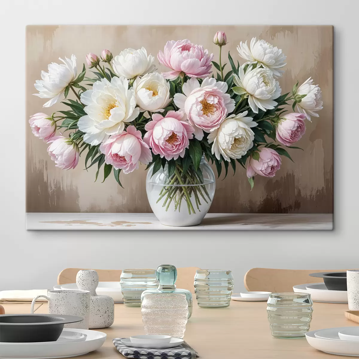 Tableau Un bouquet de belles pivoines roses et blanches dans un vase en verre, disposé sur une surface en bois Nr s40398