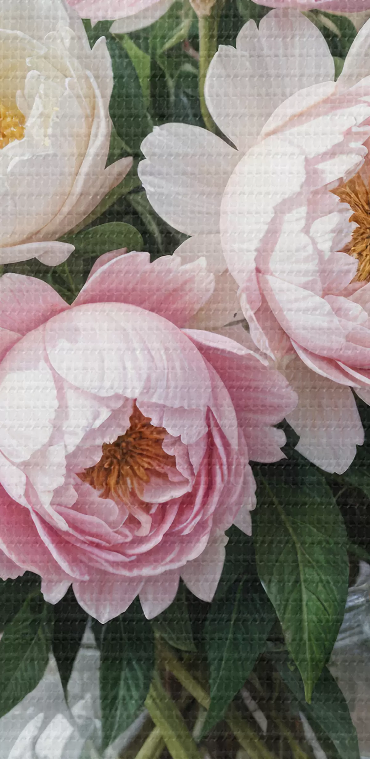 Tableau Un bouquet de belles pivoines roses et blanches dans un vase en verre, disposé sur une surface en bois s40398
