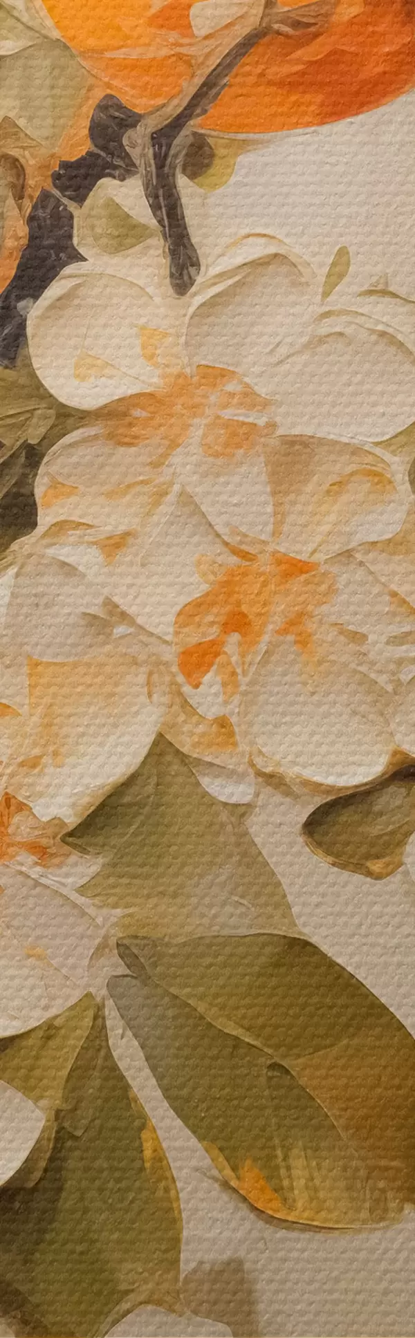 Tableau Branche avec des fleurs blanches et des oranges sur un fond gris-beige Nr s40486