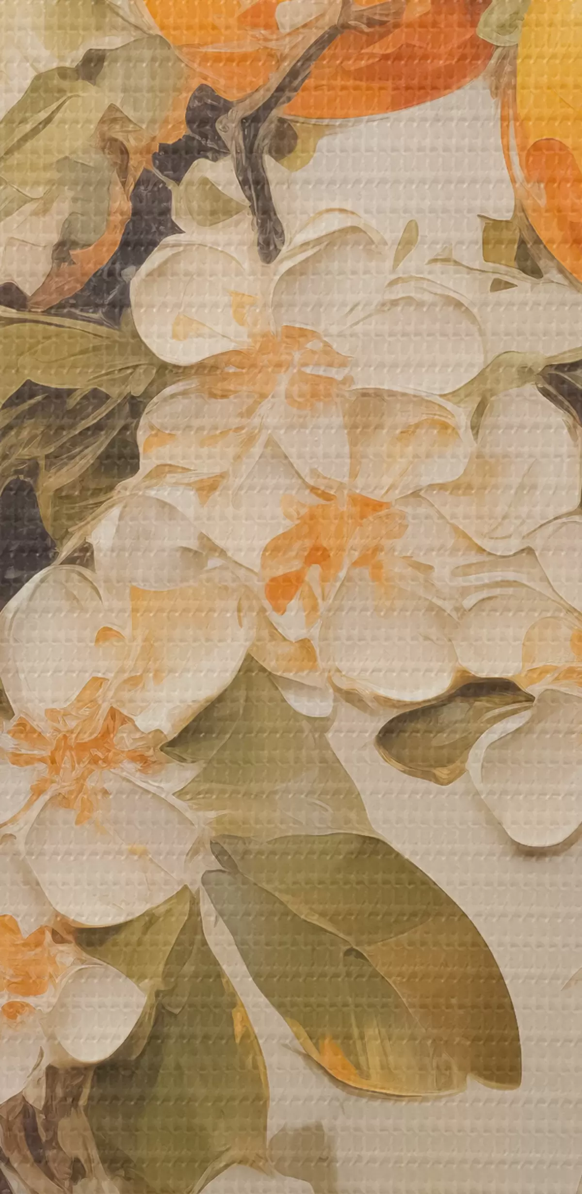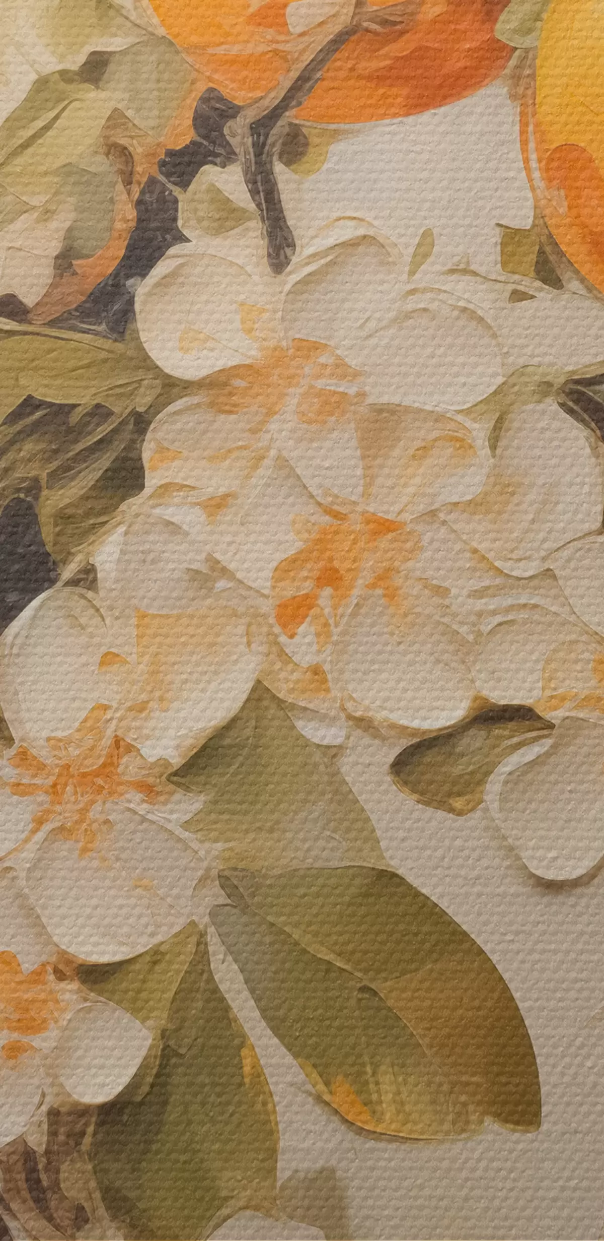 Tableau Branche avec des fleurs blanches et des oranges sur un fond gris-beige Nr s40486
