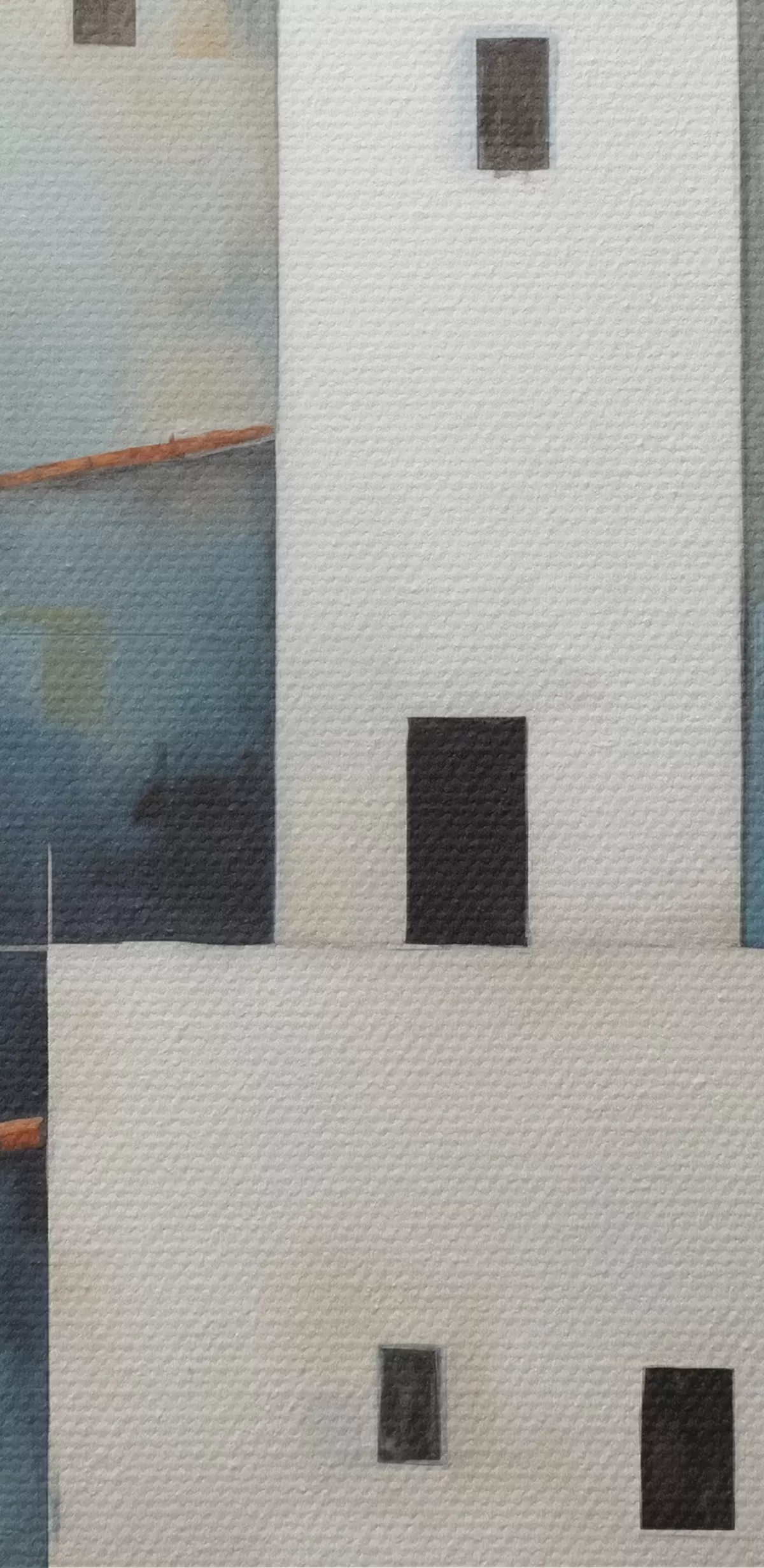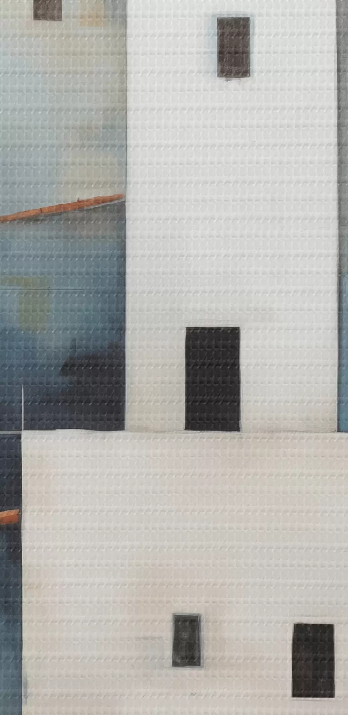 Tableau Maisons stylisées blanches abstraites, couleur rouge, orange, jaune, bleu s40531