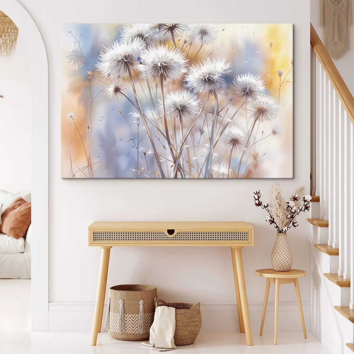 Tableau Fleurs de pissenlit blanches et moelleuses sur un fond aquarelle flou avec un éclairage chaleureux Nr s40541