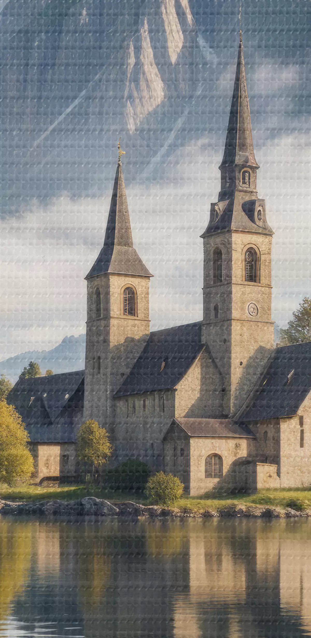 Tableau Un village alpin pittoresque niché au bord d'un lac serein, avec d'imposantes montagnes enneigées Nr s40554