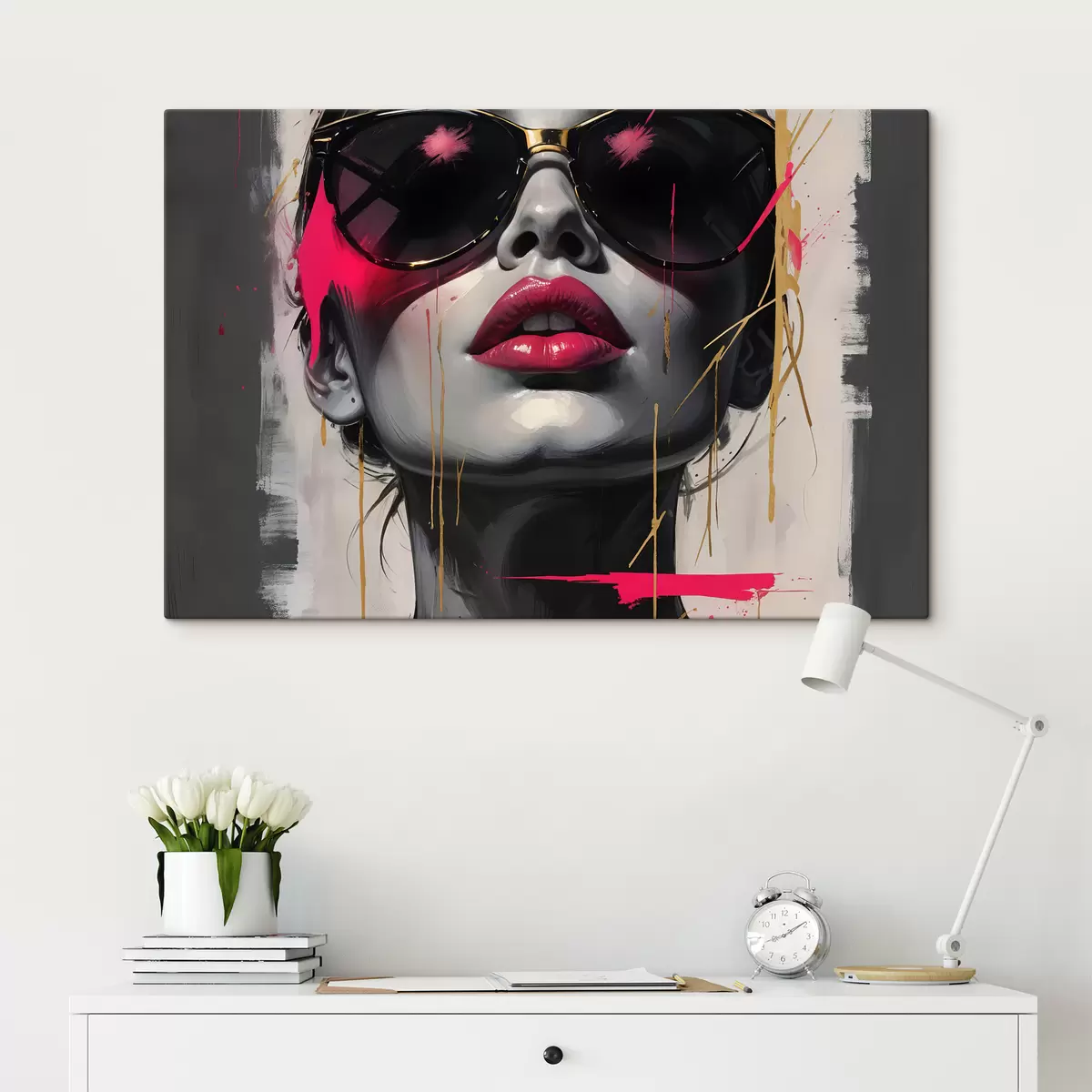 Tableau Portrait abstrait d'une jeune femme portant des lunettes de soleil avec des lèvres roses et des formes abstraites et des touches de rose  s40558