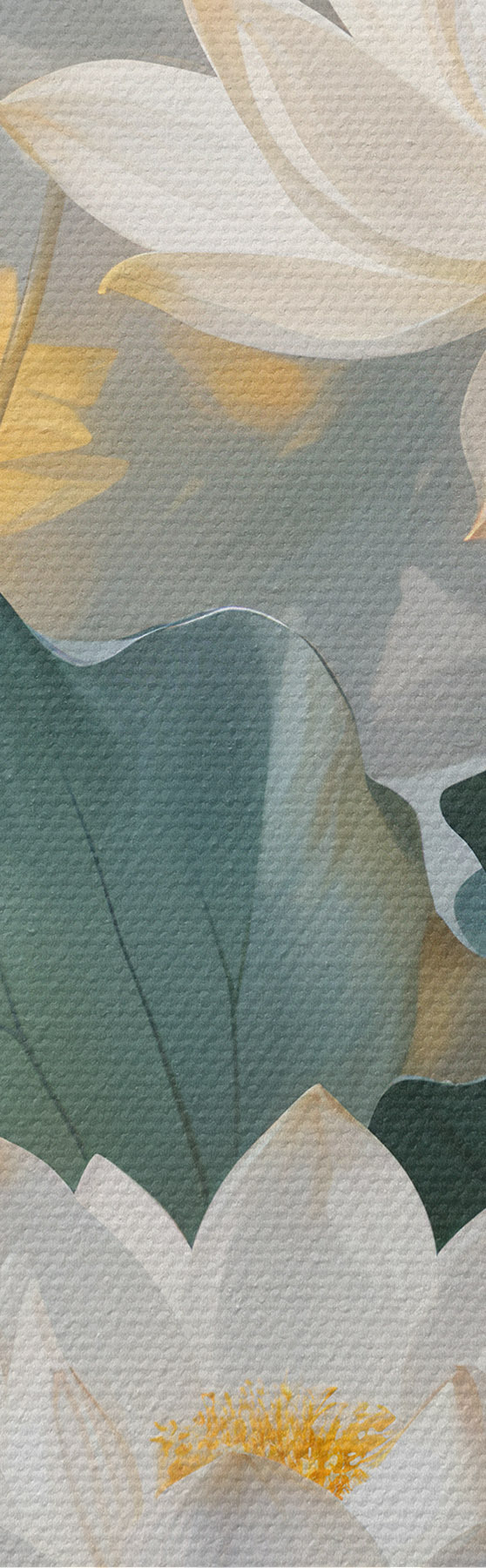 Tableau Fleurs de lotus blanches dans un étang avec des nénuphars verts, entourées de fleurs jaunes et d'un arrière-plan flou s40559