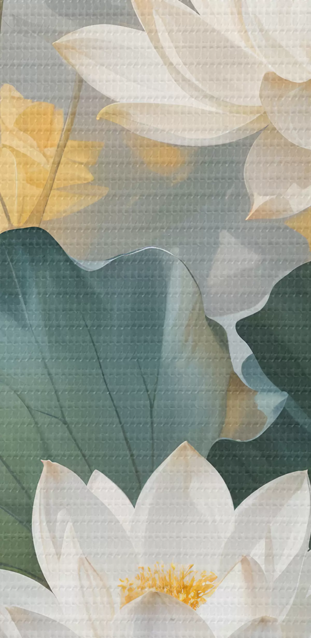 Tableau Fleurs de lotus blanches dans un étang avec des nénuphars verts, entourées de fleurs jaunes et d'un arrière-plan flou s40559