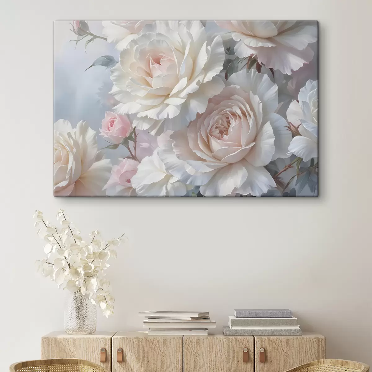 Tableau Douces et délicates roses blanches et roses sur fond flou s40562