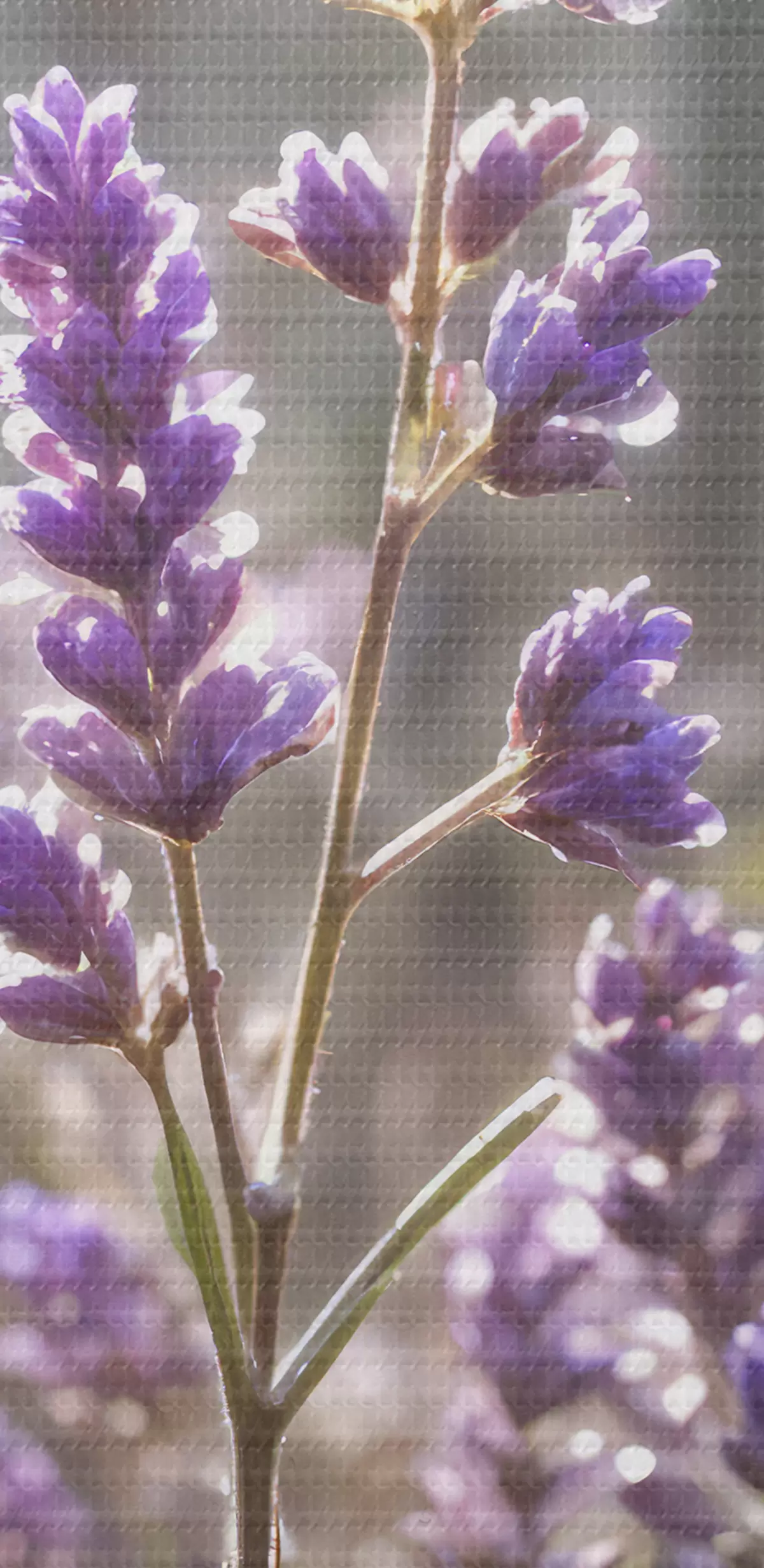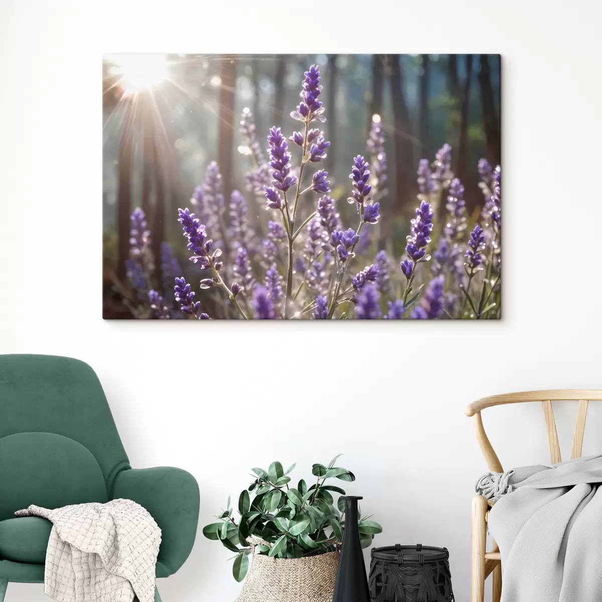 Tableau Fleurs de lavande violettes dans un champ, avec un arrière-plan de forêt flou et la lumière du soleil filtrant à travers s40570